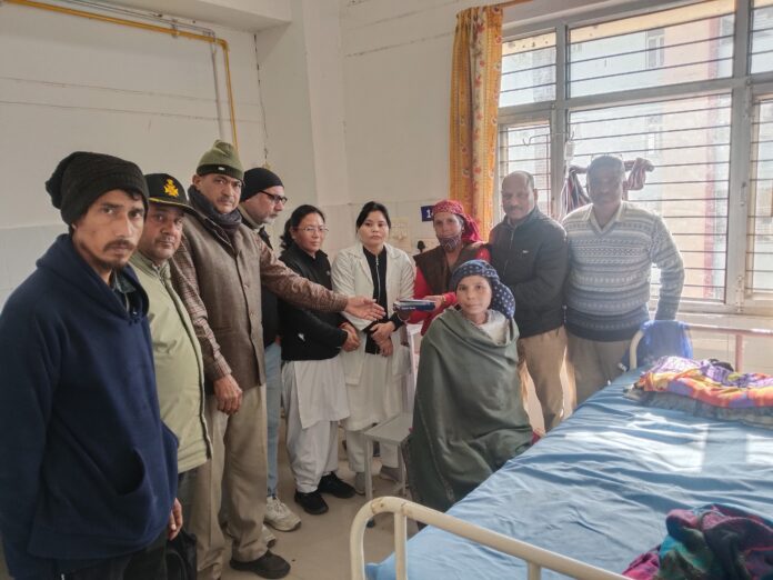 कोटद्वार बेस अस्पताल में आग से झुलसी महिला को आर्थिकी मदद देते समिति के सदस्य।