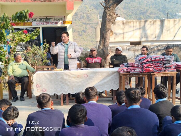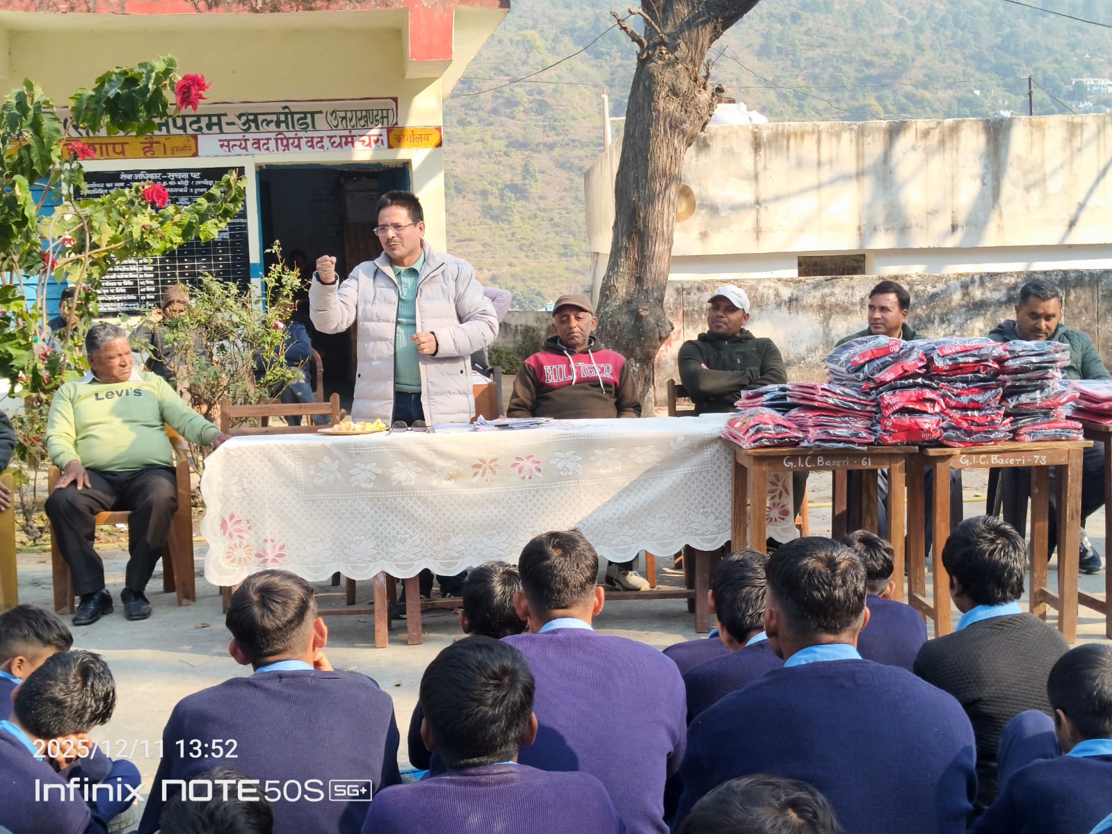 विद्यालय की प्रभारी प्रधानाचार्या सुश्री दीपिका बिष्ट ने कार्यक्रम में उपस्थित एवं ऑनलाइन जुड़े सभी गणमान्य अतिथियों के प्रति विद्यालय परिवार की ओर से हार्दिक आभार व्यक्त किया। कार्यक्रम का मंच संचालन श्री बलवंत नेगी द्वारा किया गया। उन्होंने विद्यालय के विद्यार्थियों द्वारा शैक्षणिक, खेलकूद एवं अन्य सह-पाठ्यक्रम गतिविधियों में प्राप्त उपलब्धियों की जानकारी दी। कार्यक्रम में द दून स्कूल,देहरादून के गणित विभागाध्यक्ष श्री चंदन घुघत्याल ने भावपूर्ण शब्दों में कहा कि हम सभी को अपनी जड़ों से जुड़े रहना चाहिए। उन्होंने इस बात पर बल दिया कि विद्यालयों में उत्कृष्ट शैक्षणिक वातावरण के साथ-साथ विद्यार्थियों को सामाजिक दायित्वों और सेवा भाव से भी जोड़ना अत्यंत आवश्यक है। इस अवसर पर एस सी इ आर टी के प्रवक्ता श्रीमती गंगा घुघत्याल एवम श्री गोपाल घुघत्याल, प्रधानाचार्य श्री गिरीश अमवाल, रूट्स फाउंडेशन की उपाध्यक्ष निर्मला बिष्ट , रागिनी, श्याम सिंह सहित अनेक गणमान्य व्यक्ति ऑनलाइन माध्यम से जुड़े तथा पूरा विद्यालय परिवार कार्यक्रम में सहभागी रहा। कार्यक्रम के अंत में विद्यार्थियों को ट्रैक सूट वितरित किए गए, जिससे बच्चों के चेहरों पर आत्मविश्वास, उत्साह और प्रसन्नता की झलक स्पष्ट दिखाई दी। द रूट्स फ़ाउंडेशन की निदेशिका सुश्री निवेदिता ने बताया कि संस्था का मुख्य उद्देश्य समाज से जुड़ते हुए गुणवत्तापूर्ण शिक्षा, बेहतर स्वास्थ्य एवं नशा उन्मूलन जैसे महत्वपूर्ण विषयों पर सतत कार्य करना है। उन्होंने कहा कि विद्यार्थियों को ट्रैक सूट का वितरण इसी सोच की एक सार्थक पहल है। सुश्री निवेदिता ने कार्यक्रम के सफल आयोजन हेतु विद्यालय के प्रधानाचार्य, समस्त शिक्षकवर्ग तथा विद्यार्थियों का हृदय से आभार व्यक्त किया। साथ ही द रूट्स फ़ाउंडेशन को निरंतर सहयोग प्रदान करने वाले सभी सहयोगियों के प्रति भी कृतज्ञता प्रकट की।