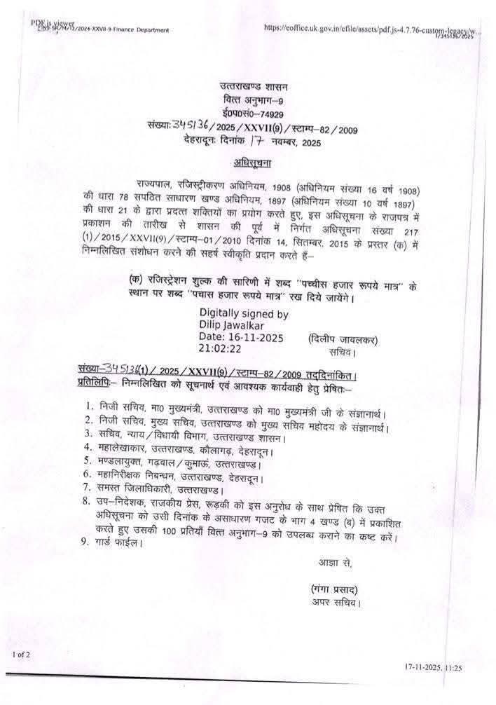 देहरादून। अगर आप जमीन खरीदना चाहते हैं य जमीन खरीदने वाले हैं तो यहां खबर आपके लिए है। उत्तराखंड में अब जमीन खरीदते वक्त आपको रजिस्ट्री के लिए दोगुनी रकम देनी होगी। प्रदेश सरकार ने रजिस्ट्री शुल्क में बाद संशोधन करते हुए इसे 25 हजार रुपये से बढ़ाकर 50 हजार रुपये कर दिया है। नई दरें वित्त विभाग के आदेश जारी होने के बाद तुरंत प्रभाव से लागू हो गई हैं। इसे राज्य सरकार का राजस्व बढ़ाने की दिशा में महत्वपूर्ण कदम माना जा रहा है।