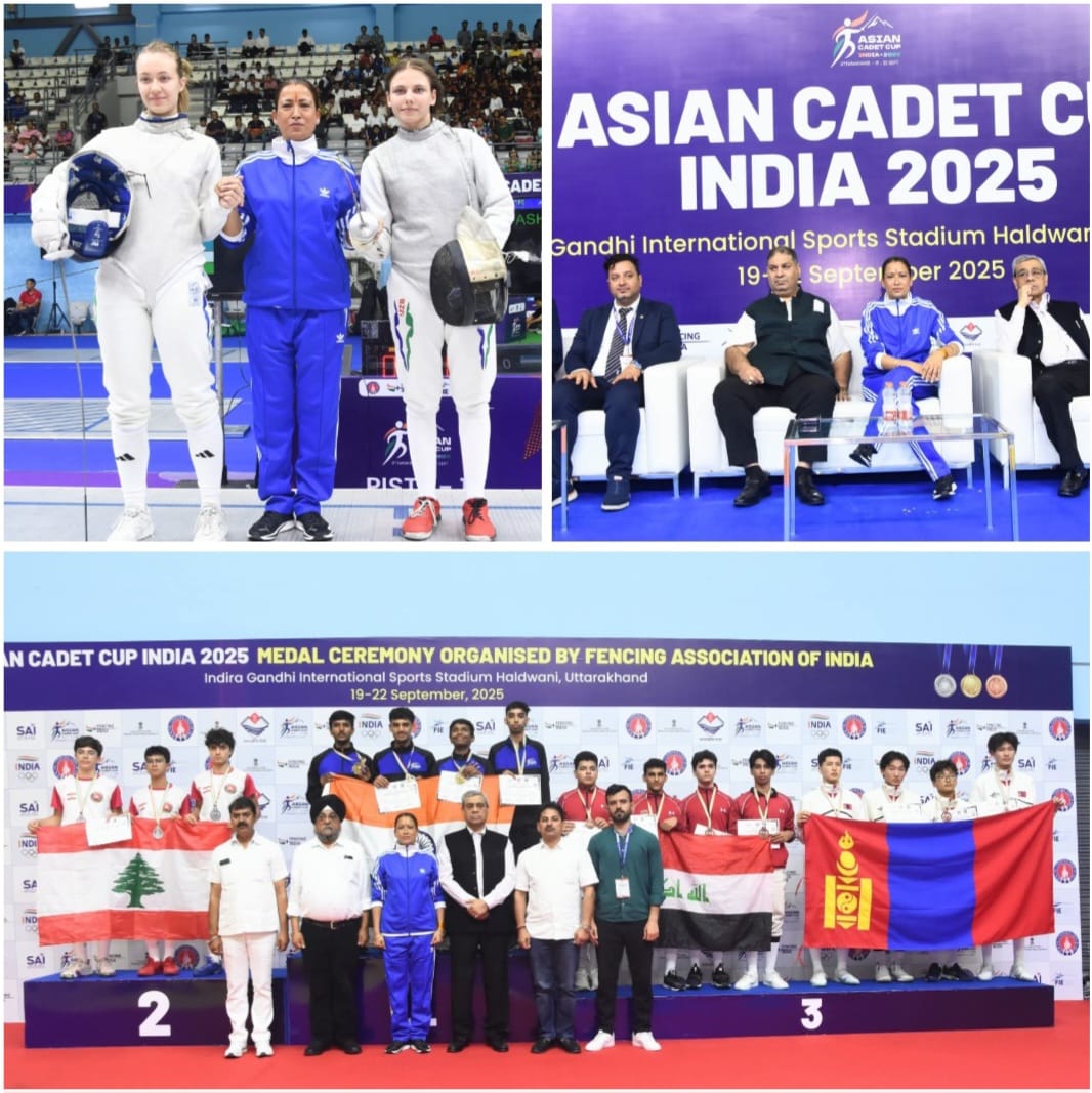 हल्द्वानी के इंदिरा गांधी इंटरनेशनल स्पोर्ट्स स्टेडियम में 19 सितंबर से चल रही एशियन कैडेट कप फेंसिंग चैंपियनशिप का रविवार को समापन हो गया। कैबिनेट मंत्री रेखा आर्या प्रतियोगिता का अंतिम मैच देखने स्टेडियम पहुंची थी। इसके बाद उन्होंने सभी विजेता खिलाड़ियों और टीमों को पदक वितरित कर सम्मानित किया।