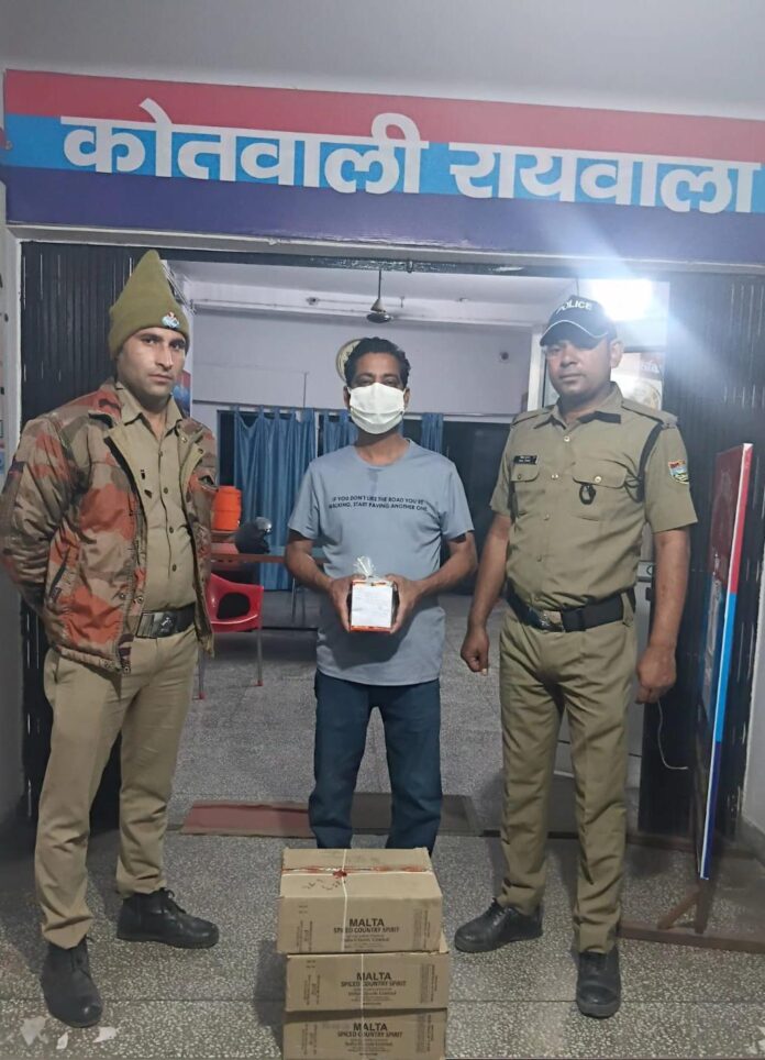 इसी क्रम में जनपद को नशा मुक्त करने व नशा (अवैध शराब/चरस/ स्मैक/गांजा आदि)तस्करों के विरुद्ध चलाये जा रहे अभियान के अंतर्गत कोतवाली रायवाला पर गठित पुलिस द्वारा दिनांक 21-04-2026 को चैकिंग के दौरान मुखबिर की सूचना पर सत्यनारायण मंदिर के पास मिड-वे रेस्टोरेंट के सामने से 01 अभियुक्त समीर सिंह चौहान पुत्र उदय सिंह चौहान को 135 टैट्रा पैक (कुल 03 पेटी) देशी शराब के साथ गिरफ्तार किया गया। अभियुक्त के विरुद्ध *कोतवाली रायवाला पर मु0अ0सं0: 56/26 धारा: 60/72 आबकारी अधि0* का अभियोग पंजीकृत किया गया।