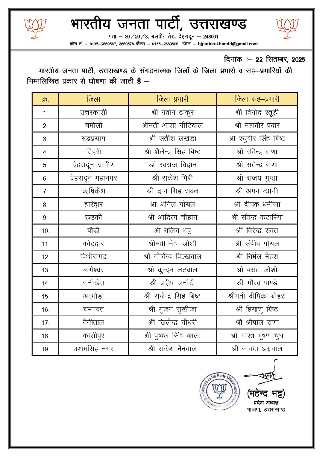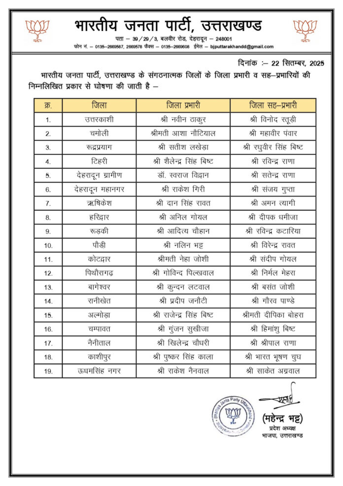 भारतीय जनता पार्टी, उत्तराखण्ड के संगठनात्मक जिलों के जिला प्रभारी व सह-प्रभारियों की घोषणा की जाती हैl