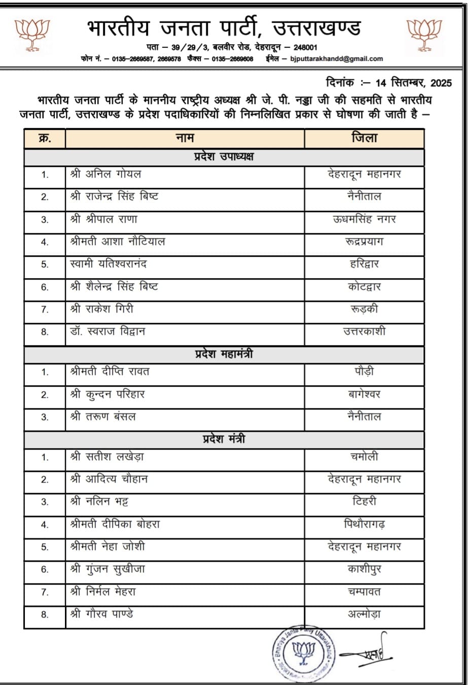 देहरादून। भाजपा ने प्रदेश पदाधिकारियों की घोषणा कर दी है।