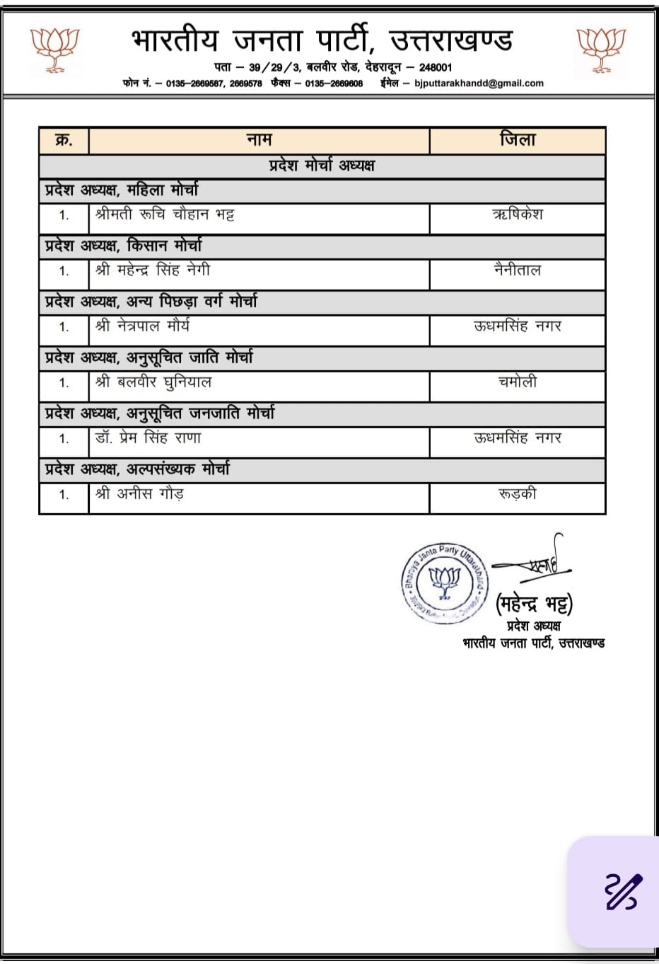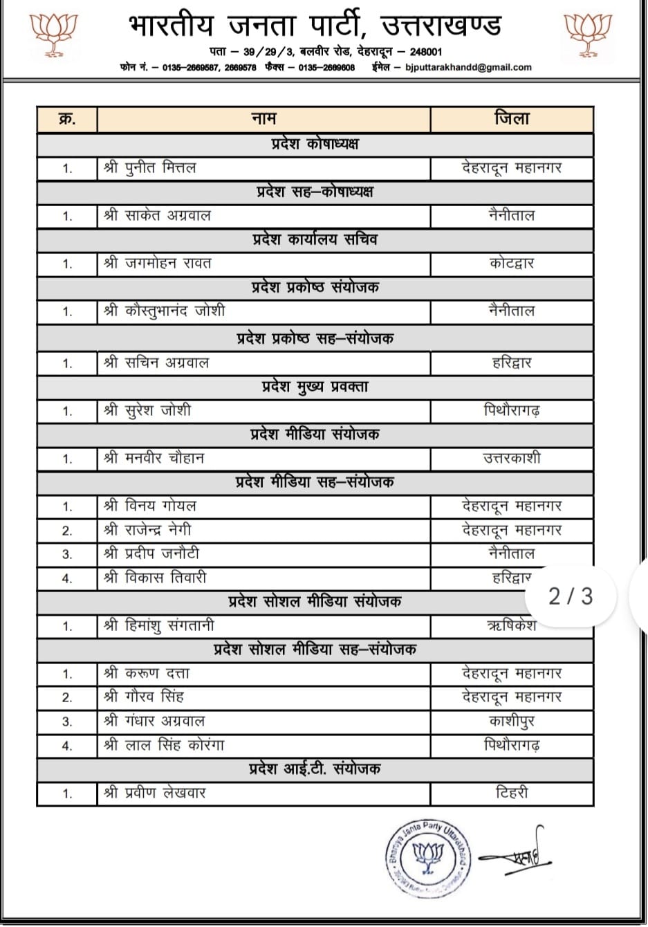 प्रदेश अध्यक्ष महेंद्र भट्ट के निर्देश पर संगठन के विभिन्न मोर्चो और विभाग मे 42 लोगों को दायित्व दिये गए है।