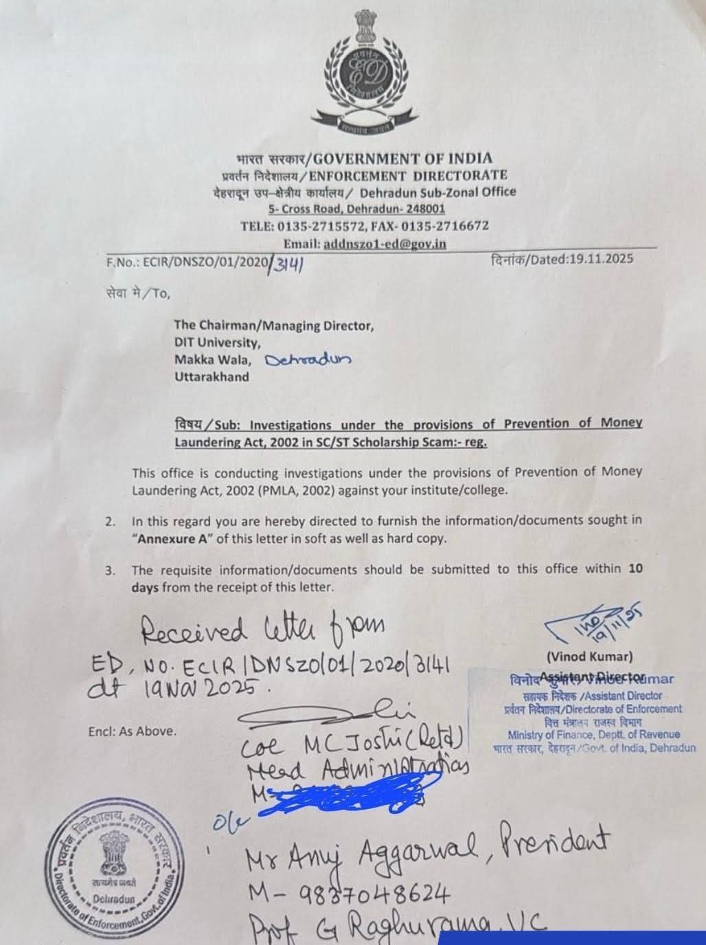DIT यूनिवर्सिटी को मनी लॉन्ड्रिंग मामले में ईडी ने भेजो नोटिस, एससी एसटी स्कॉलरशिप घोटाले से जुड़ा है मामला