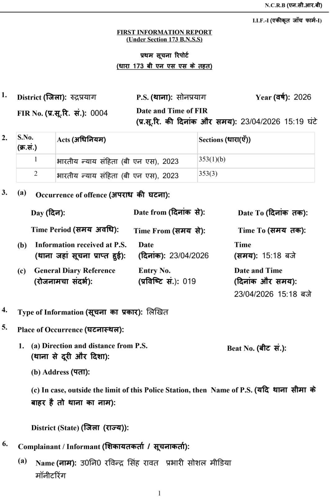 रुद्रप्रयाग। चारधाम यात्रा के संबंध में भ्रामक, अपुष्ट एवं तथ्यहीन वीडियो/सामग्री प्रसारित करने पर थाना सोनप्रयाग में संबंधित व्यक्ति के विरुद्ध प्राथमिकी दर्ज कर विधिक कार्यवाही प्रारंभ कर दी गई है। साथ ही, ऐसे अन्य 4-5 संदिग्ध वीडियो भी चिन्हित किए गए हैं, जिनकी गहन जांच की जा रही है और उनके विरुद्ध भी नियमानुसार कठोर कार्रवाई सुनिश्चित की जाएगी।