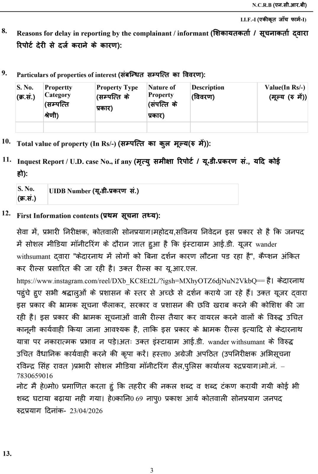 जनपद रुद्रप्रयाग में सोशल मीडिया मॉनीटरिंग के दौरान एक ऐसा वीडियो संज्ञान में आया, जिसमें केदारनाथ धाम में श्रद्धालुओं को दर्शन से वंचित किए जाने संबंधी गलत जानकारी प्रसारित की जा रही थी। प्रकरण को गंभीरता से लेते हुए थाना सोनप्रयाग में संबंधित व्यक्ति के विरुद्ध प्राथमिकी दर्ज कर विधिक कार्यवाही प्रारंभ कर दी गई है। मामले की जांच प्रचलित है। साथ ही, ऐसे अन्य 4–5 संदिग्ध वीडियो भी चिन्हित किए गए हैं, जिनकी गहन जांच की जा रही है और उनके विरुद्ध भी नियमानुसार कठोर कार्रवाई सुनिश्चित की जाएगी।