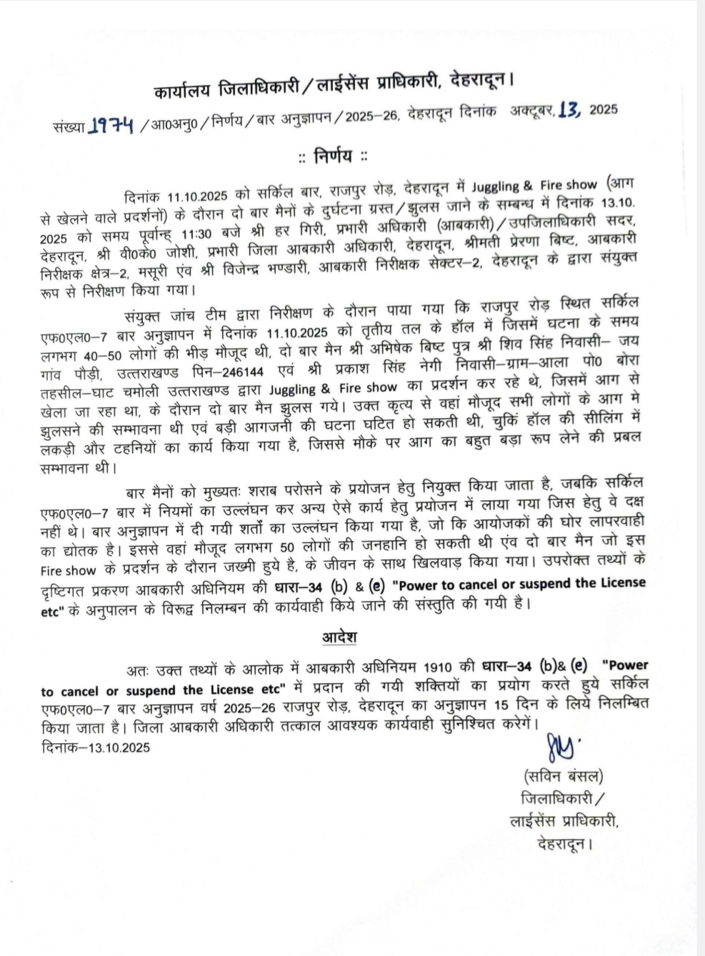 आमजन की सुरक्षा सर्वोपरि का मंत्र लिए जिला प्रशासन अपने सख्त रुख पर कायम है ताजा मामला राजपुर रोड स्थित सर्किल बार का है जहां आयोजकों की लापरवाही से आगजनी की घटना हो गई सुरक्षा मानकों की पूर्ण तरह अहवेलना करना प्रकाश में आया जिस पर सख्त रुख अपनाते हुए जिलाधिकारी ने बार का लाइसेंस निलंबित कर दिया है।