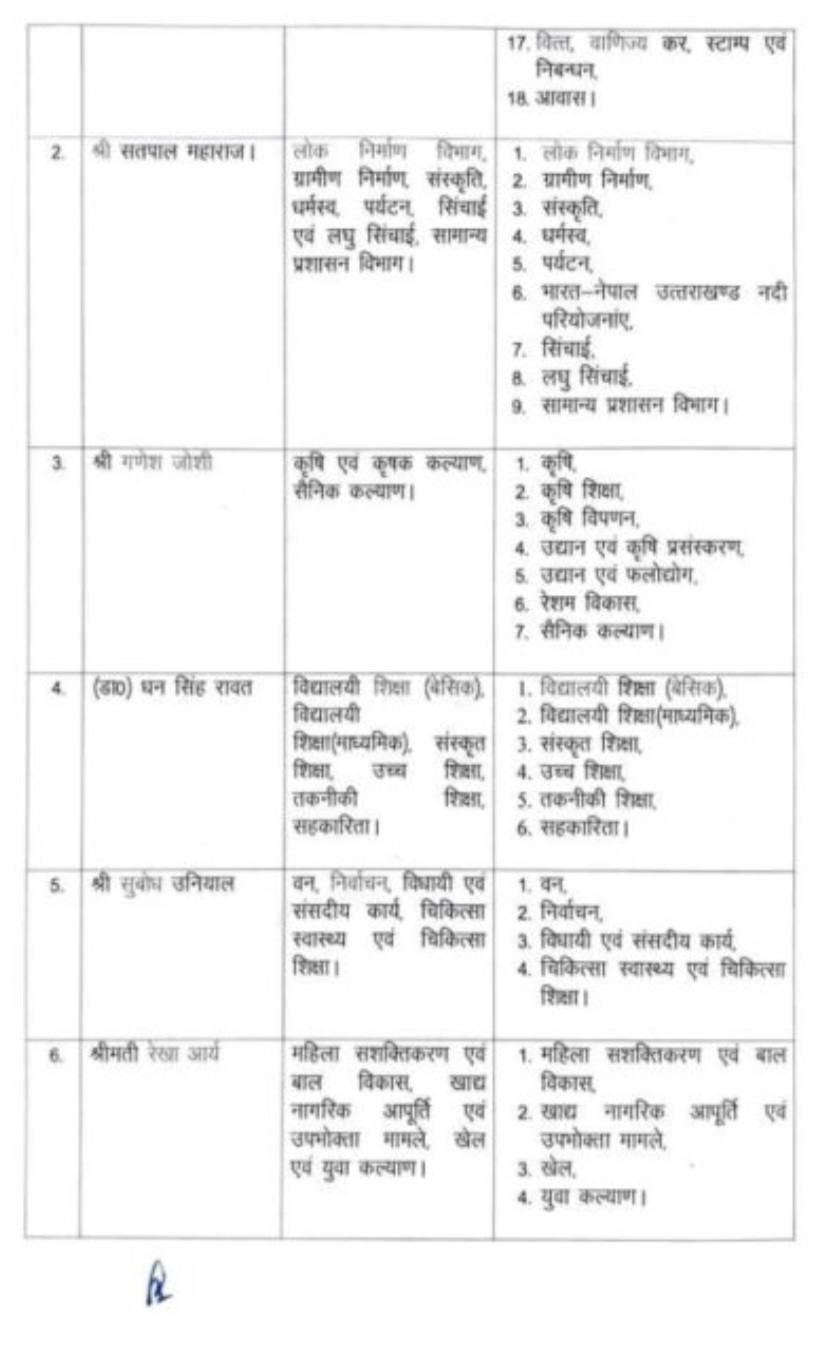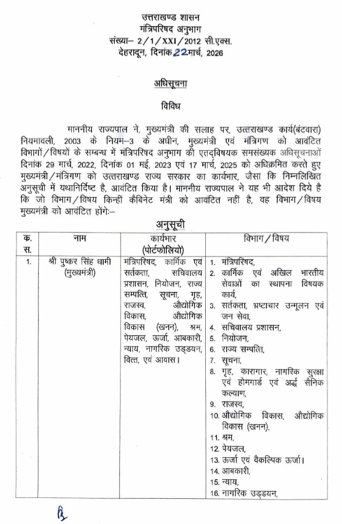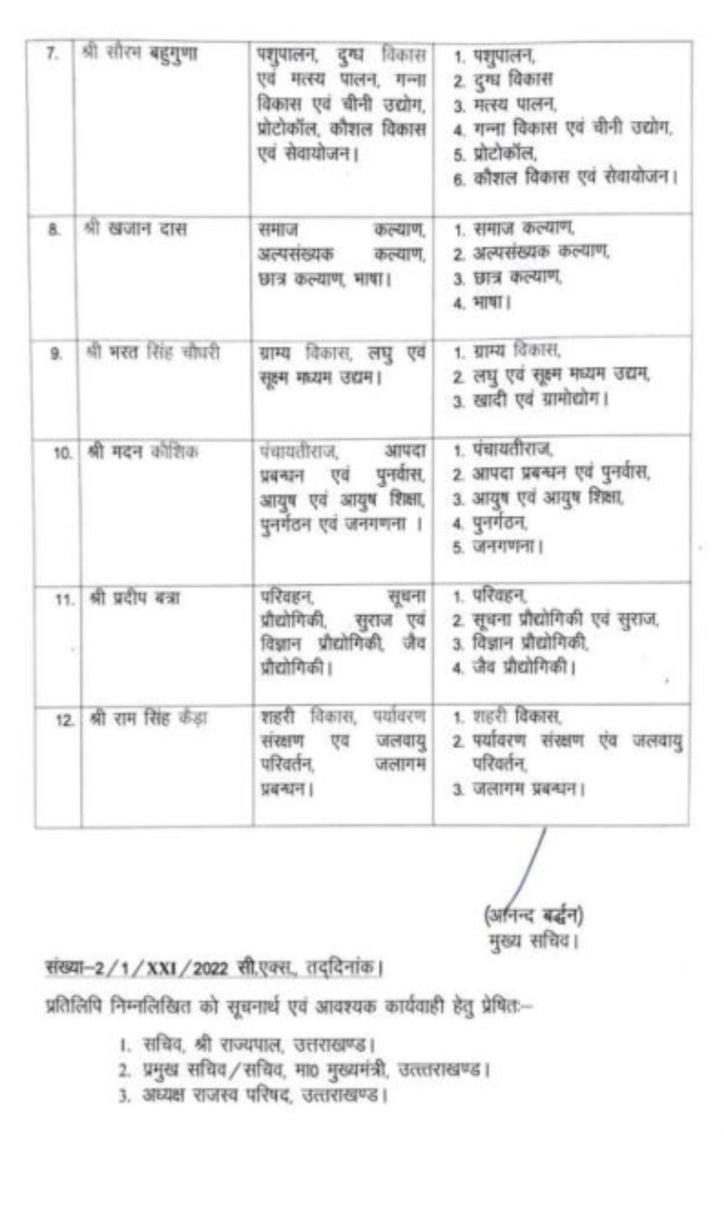 देहरादून। आज कैबिनेट विस्तार के बाद अब मुख्यमंत्री पुष्कर सिंह धामी ने विभागों का बंटवारा कर दिया है। अब तक सीएम धामी 35 से अधिक विभागों का कामकाज देख रहे थे, लेकिन अब सीएम ने अपने कई विभागों को नए मंत्रियों को सौंप दिया है। जिनका हाल ही में मंत्री पद सौंपा गया।