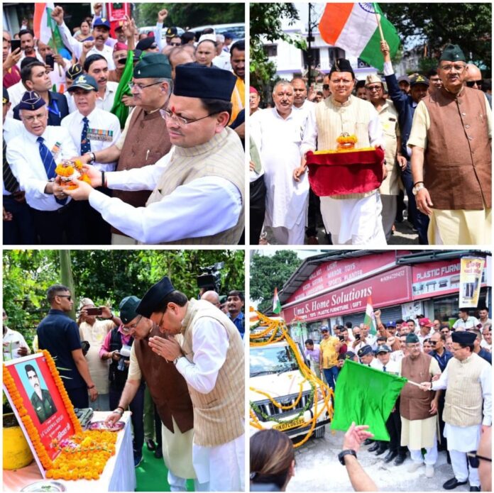 देहरादून। मुख्यमंत्री श्री पुष्कर सिंह धामी ने गुरूवार को शहीद राईफल मैन नरेश कुमार के गुजराड़ा मानसिंह सहस्त्रधारा रोड़ स्थित आवास से शहीद सम्मान यात्रा 2 का शुभारम्भ किया। मुख्यमंत्री ने इससे पहले शहीद राईफलमैन नरेश कुमार के चित्र पर माल्यार्पण के साथ ही शहीद स्थल पर पुष्प चक्र अर्पित कर शहीदों को श्रद्धांजलि अर्पित की।