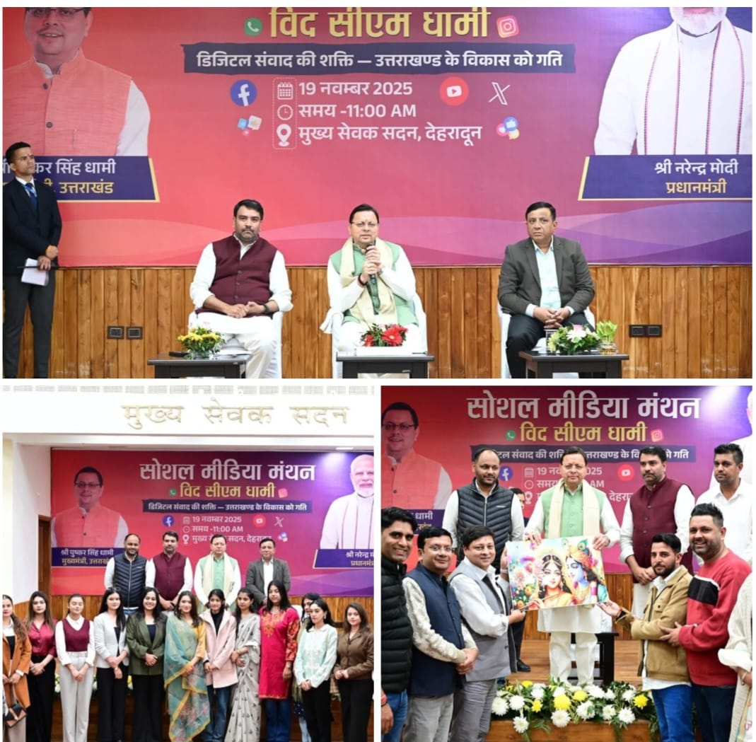मुख्य सेवक सदन में आयोजित “सोशल मीडिया मंथन” कार्यक्रम को संबोधित करते हुए मुख्यमंत्री पुष्कर सिंह धामी ने कहा कि आज सोशल मीडिया संचार और सूचना के आदान-प्रदान का सबसे तेज और प्रभावी माध्यम बन चुका है। सोशल मीडिया ने आम नागरिक की आवाज को मंच प्रदान किया है। यही कारण है कि आज विश्व की बड़ी से बड़ी घटना से लेकर एक गांव की छोटी सी समस्या तक कुछ ही सेकंड में लाखों-करोड़ों लोगों तक पहुँच जाती है।