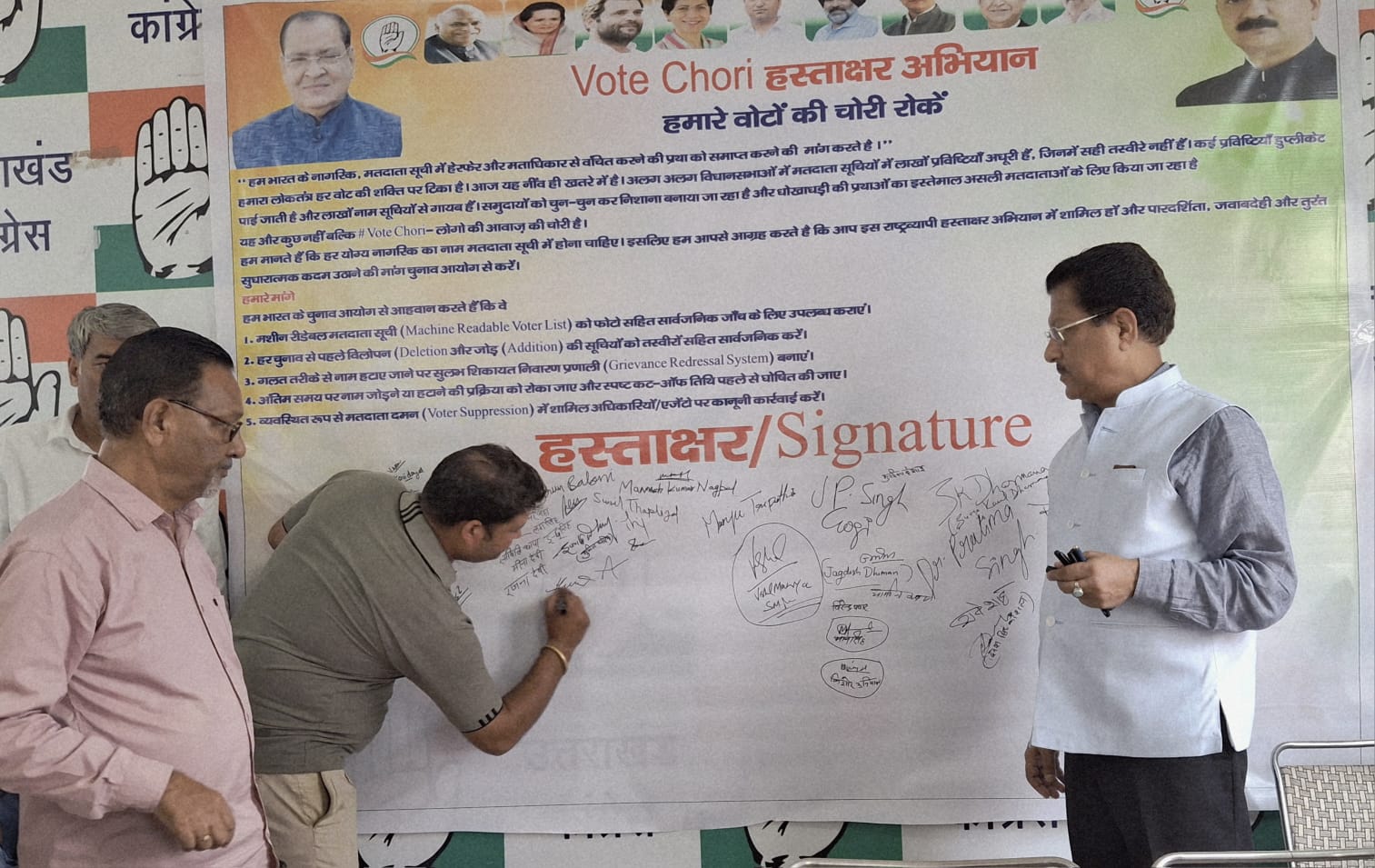 देहरादून: वोट चोरी के खिलाफ कांग्रेस द्वारा चलाए जा रहे आंदोलन के दूसरे चरण में आज राष्ट्रव्यापी हस्ताक्षर अभियान के तहत उत्तराखंड में भी कांग्रेस का हस्ताक्षर अभियान शुरू हो गया । प्रदेश कांग्रेस मुख्यालय में प्रदेश कांग्रेस कमेटी के वरिष्ठ उपाध्यक्ष संगठन सूर्यकांत धस्माना ने विधिवत रूप से पार्टी मुख्यालय में पत्रकारों वार्ता के बाद पार्टी पदाधिकारियों व कार्यकर्ताओं के साथ हस्ताक्षर अभियान का श्री गणेश किया। पार्टी सभागार में लगे वोट चोरी के खिलाफ हस्ताक्षर अभियान के बैनर पर हस्ताक्षर कर श्री धस्माना ने अभियान के लिए छपे फार्म पर हस्ताक्षर किए व उनके बाद पार्टी के वरिष्ठ पदाधिकारियों व कार्यकर्ताओं ने हस्ताक्षर किए।