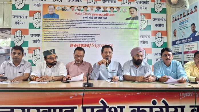 देहरादून: वोट चोरी के खिलाफ कांग्रेस द्वारा चलाए जा रहे आंदोलन के दूसरे चरण में आज राष्ट्रव्यापी हस्ताक्षर अभियान के तहत उत्तराखंड में भी कांग्रेस का हस्ताक्षर अभियान शुरू हो गया । प्रदेश कांग्रेस मुख्यालय में प्रदेश कांग्रेस कमेटी के वरिष्ठ उपाध्यक्ष संगठन सूर्यकांत धस्माना ने विधिवत रूप से पार्टी मुख्यालय में पत्रकारों वार्ता के बाद पार्टी पदाधिकारियों व कार्यकर्ताओं के साथ हस्ताक्षर अभियान का श्री गणेश किया। पार्टी सभागार में लगे वोट चोरी के खिलाफ हस्ताक्षर अभियान के बैनर पर हस्ताक्षर कर श्री धस्माना ने अभियान के लिए छपे फार्म पर हस्ताक्षर किए व उनके बाद पार्टी के वरिष्ठ पदाधिकारियों व कार्यकर्ताओं ने हस्ताक्षर किए।