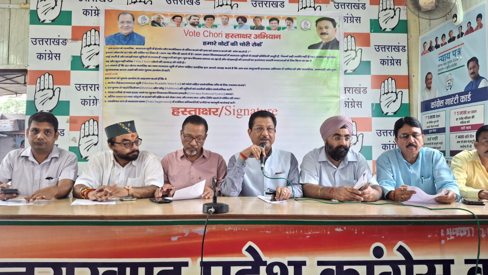 इस अवसर पर श्री धस्माना ने मीडियाकर्मियों को संबोधित करते हुए कहा कि विगत सात अगस्त को कर्नाटक की एक लोकसभा सीट की एक ही विधानसभा में कैसे चुनाव आयोग की मिलीभगत से एक लाख से ज्यादा फर्जी वोट की बदौलत भाजपा ने सेंट्रल बेंगलुरु की हारी हुई सीट जीत ली। श्री धस्माना ने कहा कि राहुल गांधी के इस खुलासे के बाद पूरे देश की जनता इस सच्चाई को जन गई है कि भाजपा चुनाव आयोग की मिलीभगत से पिछले अनेक वर्षों से वोट चोरी करके केंद्र व राज्य में सरकारें बना रही है इसलिए देश भर में वोट चोरी के मुद्दे पर लोग आंदोलित हो रहे हैं। श्री धस्माना ने कहा कि उत्तराखंड समेत देश के हर प्रांत में कांग्रेस पार्टी द्वारा आयोजित वोट चोर गद्दी छोड़ रैलियां में जन सैलाब सड़कों पर उतरा और अब एक महीने के हस्ताक्षर अभियान में देश भर में पांच करोड़ नागरिकों से वोट चोरी के खिलाफ हस्ताक्षर करवा कर भारत के चुनाव आयोग को सौंपा जायेगा। श्री धस्माना ने कहा कि उत्तराखंड की सभी 70 विधानसभाओं से पांच लाख नागरिकों से हस्ताक्षर करवा कर राष्ट्रीय अध्यक्ष श्री मल्लिकार्जुन खड़गे व लोक सभा में विपक्ष के नेता श्री राहुल गांधी जी को सौंपा जायेगा।
