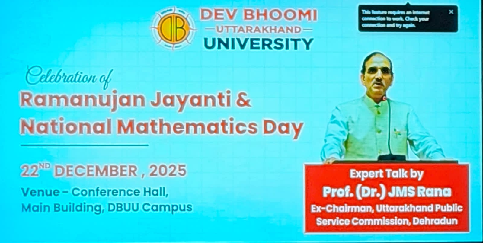 आज देव भूमि उत्तराखंड विश्वविद्यालय, देहरादून के प्रांगण में राष्ट्रीय गणित दिवस के अवसर पर एक गरिमामय एवं बौद्धिक कार्यक्रम का आयोजन किया गया। यह दिवस महान गणितज्ञ श्रीनिवास रामानुजन की स्मृति में मनाया जाता है और इसका उद्देश्य गणित के महत्व को समाज तथा शिक्षा के क्षेत्र में रेखांकित करना है।