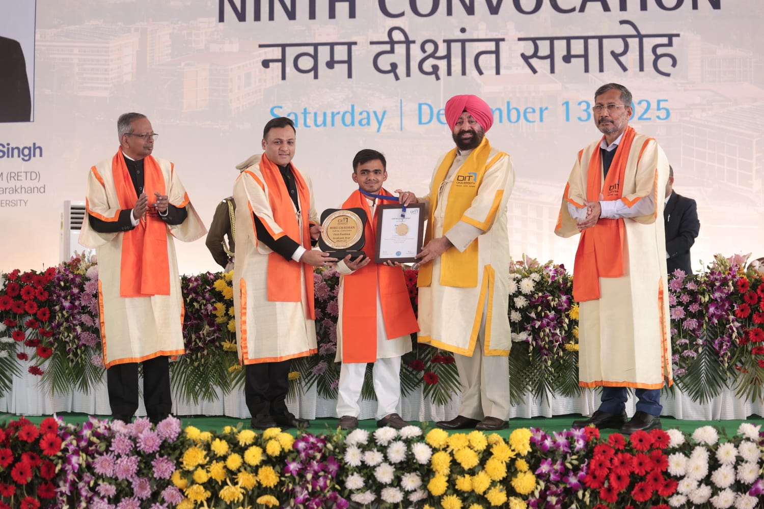 डीआईटी विश्वविद्यालय, देहरादून का 19वां दीक्षांत समारोह शनिवार, 13 दिसंबर 2025 को डीआईटी परिसर में आयोजित किया गया। समारोह की अध्यक्षता उत्तराखंड के माननीय राज्यपाल लेफ्टिनेंट जनरल (सेवानिवृत्त) श्री गुरमीत सिंह ने की। इस अवसर पर डीआईटी विश्वविद्यालय के अध्यक्ष श्री अनुज अग्रवाल, प्रधान सलाहकार श्री एन. रविशंकर (आईएएस, सेवानिवृत्त), कुलपति प्रो. जी. रघुरामा, बोर्ड ऑफ गवर्नर्स, बोर्ड ऑफ मैनेजमेंट तथा एकेडमिक काउंसिल के सदस्यगण गरिमामयी उपस्थिति में उपस्थित रहे।