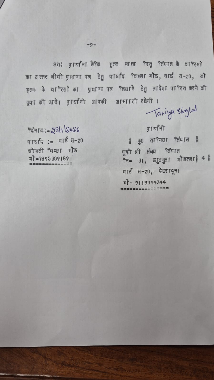 देहरादून। , माता के निधन के उपरांत विगत चार वर्षों से उत्तरजीवी प्रमाण पत्र हेतु विभिन्न कार्यालयों के चक्कर लगा रही सुश्री तान्या सिंघल को जिला प्रशासन की त्वरित कार्रवाई से राहत मिली है।