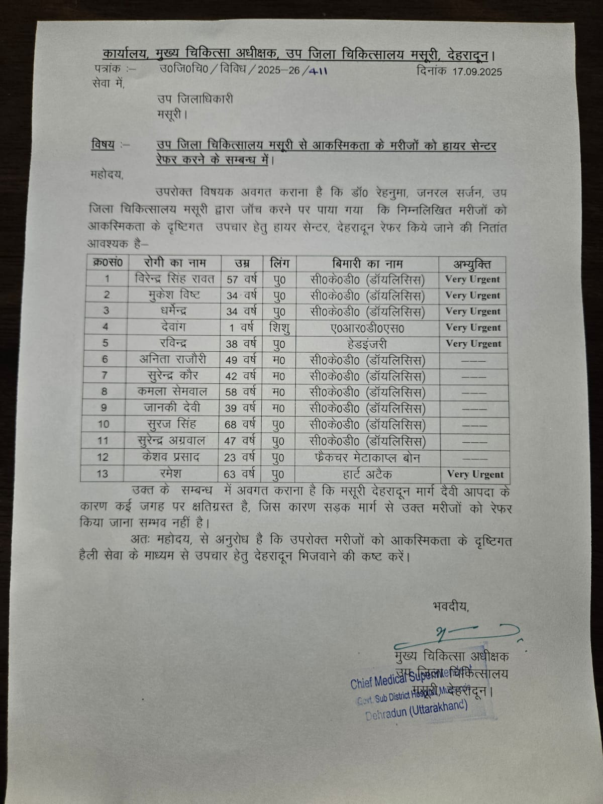 देहरादून 17 सितम्बर 2025 (सू.वि.) अतिवृष्टि के कारण मसूरी रोड का एक हिस्सा वाशआउट होने से देहरादून के सीधे सम्पर्क से कटी मसूरी डायलिसिस एवं अन्य गंभीर बीमारी से ग्रसित मरीजों को तत्काल उपचार हेतु ट्रांसशिपमेंट किये जाने के मुख्य चिकित्सा अधीक्षक मसूरी के जिला प्रशासन को किए गए अनुरोध पर जिला प्रशासन द्वारा आज 13 मरीजों को उप जिलाधिकारी मसूरी राहुल कुमार के नेतृत्व में वाहन के माध्यम से लाया गया तथा सड़क क्षतिग्रस्त क्षेत्र से उप जिलाधिकारी कुमकुम जोशी द्वारा फोर्स एवं राजस्व कर्मचारियों की मदद से उपचार हेतु शहर तक पंहुचाया गया। पंहुचाए गए 13 लोगों में 9 डाईलिसिस, 1 हार्ट अटैक, 1 हेडइंजरी, 1फैक्ट्रचर मेटाकाप्ल बोन, एआरडीएएस से पीड़ित 1 वर्ष के शिशु को उपचार हेतु ट्रांसशिपमेंट कराते हुए एम्बुलेंस से अस्पताल पंहुचाया।