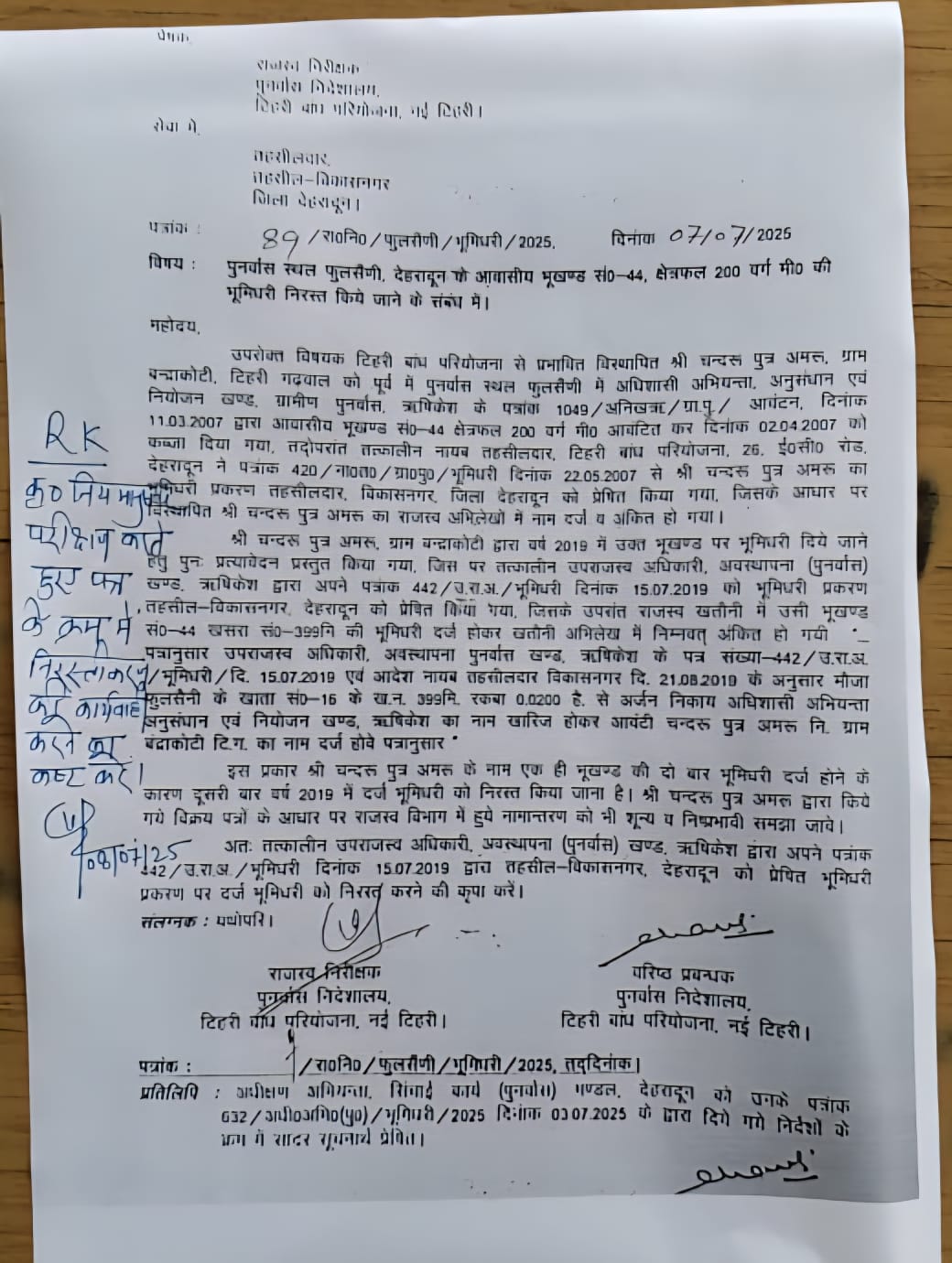 अवस्थापना पुनर्वास खण्ड ऋषिकेश का कारनामा; एक व्यक्ति जिसने अपनी भूमि 2007 में विक्रय की, बिना जांच के 2019 में उसी के नाम चढावा दी थी दोबारा भूमिधरी;