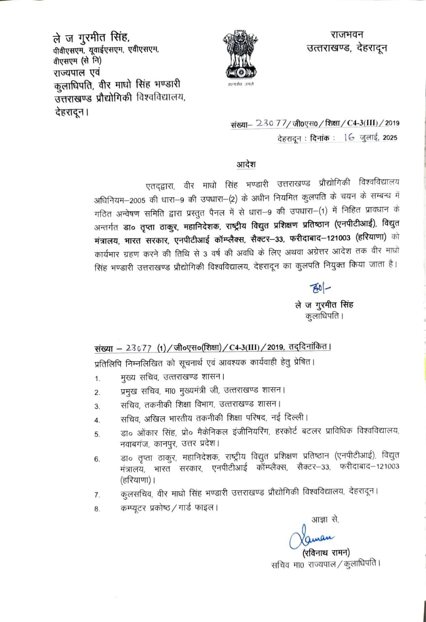 देहरादून। वीर माधो सिंह भण्डारी उत्तराखण्ड प्रौद्योगिकी विश्वविद्यालय, देहरादून में आज डॉ. तृप्ता ठाकुर को नए कुलपति के रूप में नियुक्ति दी गई है। राज्यपाल एवं कुलाधिपति गुरमीत सिंह ने विश्वविद्यालय अधिनियम की धारा 9 के तहत गठित चयन समिति की सिफारिशों पर यह नियुक्ति की।