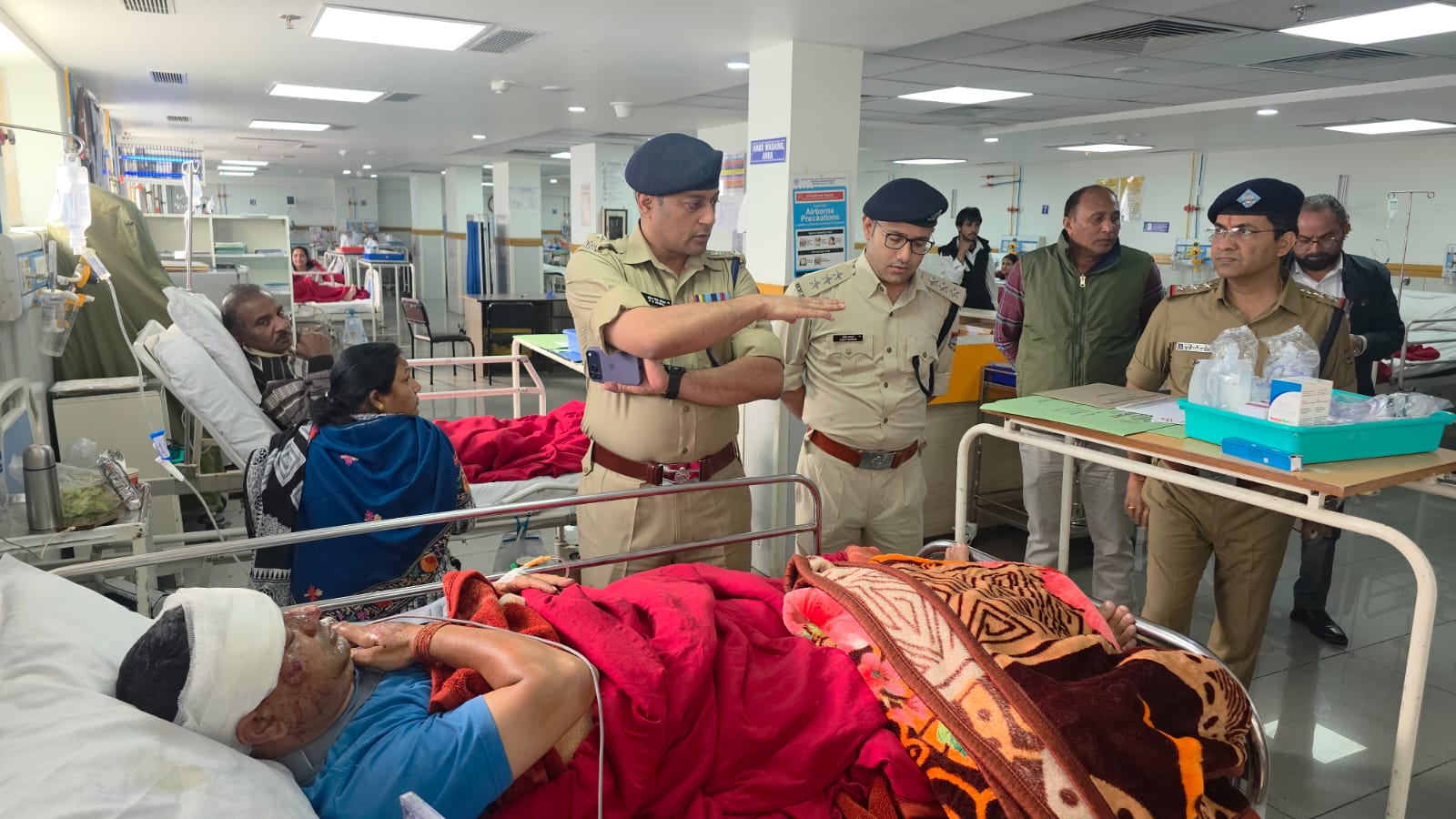 डाक्टरों से घायल पुलिस कर्मी के स्वास्थय की जानकारी प्राप्त कर उन्हें बेहतर से बेहतर इलाज उपलब्ध कराने हेतु उपस्थित अधिकारियों को दिये निर्देश