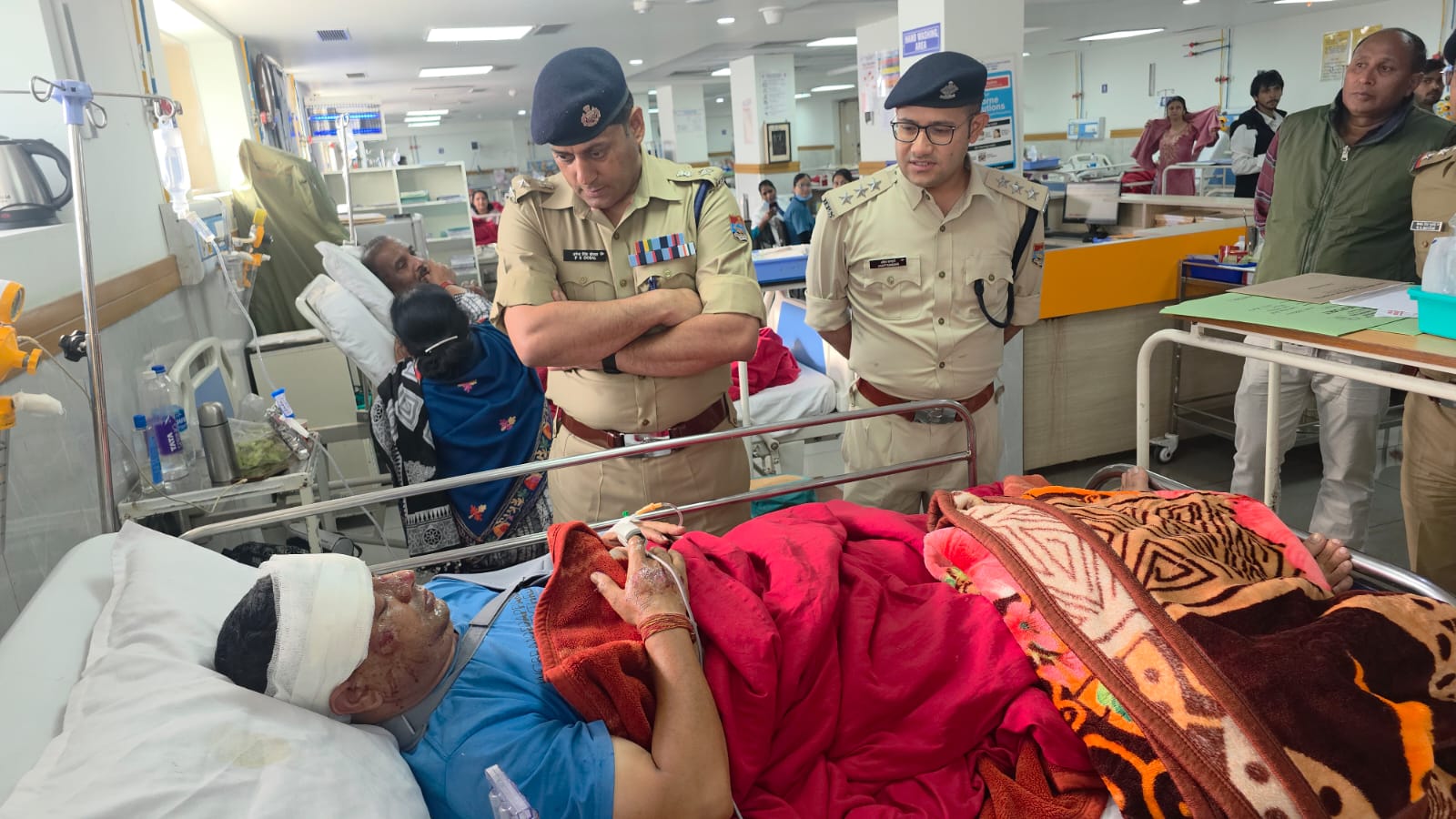 डाक्टरों से घायल पुलिस कर्मी के स्वास्थय की जानकारी प्राप्त कर उन्हें बेहतर से बेहतर इलाज उपलब्ध कराने हेतु उपस्थित अधिकारियों को दिये निर्देश