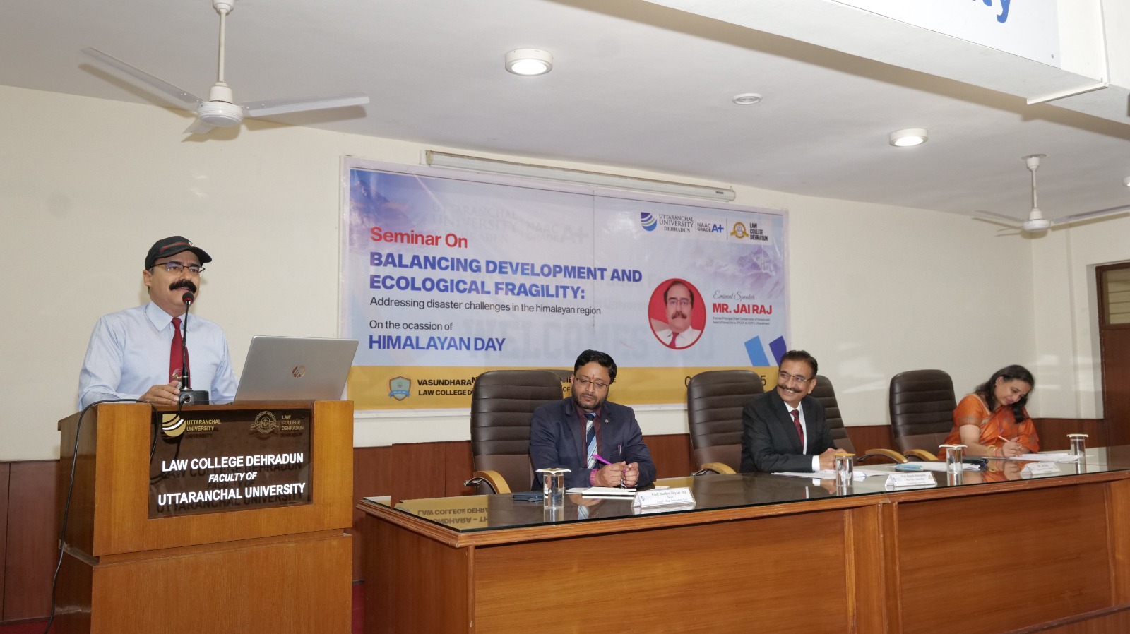 कार्यक्रम का शुभारम्भ औपचारिक रूप से हिमालय संरक्षण की शपथ के साथ किया गया। अपने सम्बोधन में श्री जयराज ने कहा कि हिमालय की संरक्षा केवल सरकारों की जिम्मेदारी नहीं अपितु यह देश के हर नागरिक की नैतिक जिम्मेदारी भी है। समाज का हर व्यक्ति अपनी.अपनी क्षमता के अनुरूप हिमालय संरक्षा में भागीदारी कर सकता है। उन्होंने कहा कि विधि व्यवसाय से जुड़े नागरिक इसमें सर्वाधिक महत्वपूर्ण भूमिका निभा सकते है। पर्यावरण संरक्षा को लेकर हुए बड़े निर्णय न्यायिक सक्रियता का परिणाम है और उनके पीछे है जुडिशियल माइन्ड। विकास एवं पारिस्थितिक नाजुकता के संतुलन पर बोलते हुए उन्होंने कहा कि हिमालयी क्षेत्र में सबसे बड़ी चुनौतियाँ है प्राकृतिक आपदाएं। इसके मुख्य कारणों पर बोलते हुए उन्होंने बुनियादी ढ़ाँचे की खामियाँए अपरिपक्व योजनाएँए नाले.खालों में बेतरतीब बसावटए सिविल सोसाइटी व विशेषज्ञों की राय की उपेक्षाए धार्मिक पर्यटन की अंधी दौड़ और आंकड़ों के प्रस्तुतीकरण की होड़ बताया। अपने वक्तव्य के समापन में उन्होंने कहा कि लोक सेवकों को स्थानीय हितधारकों के लिए अधिक सुलभ होना चाहिए और नीतियों को सतत विकास लक्ष्यों के साथ फिर से जोड़ा जाना चाहिए ताकी ष्विकास को विनाश बनने से रोका जा सके। अंततः विकास व विनाश का भी एक पैमाना हो।