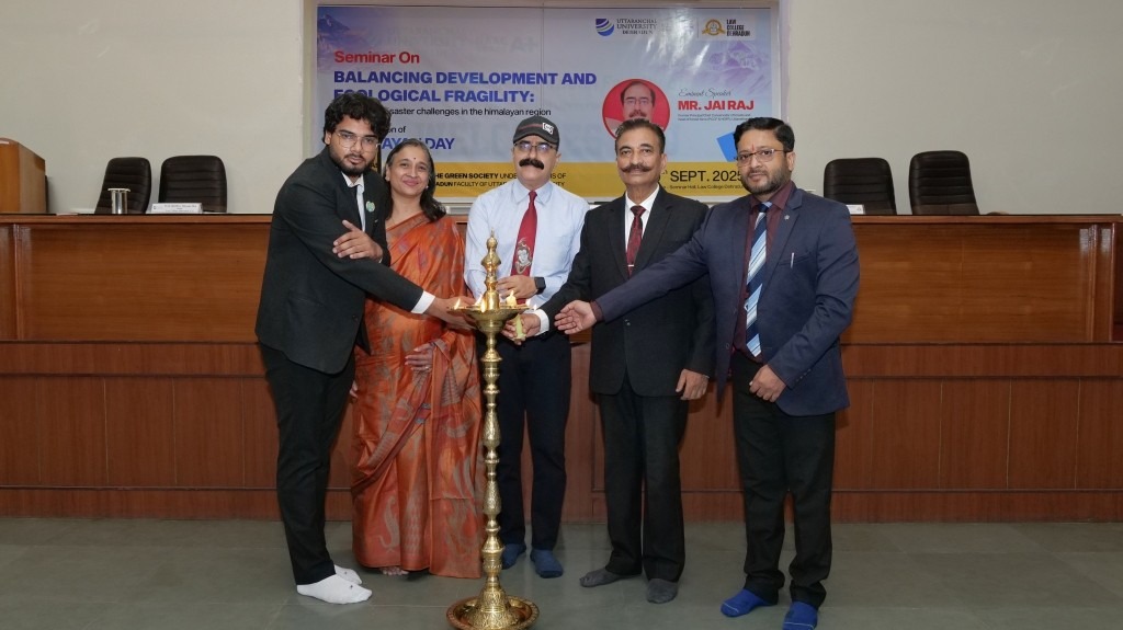 देहरादून 9 सितम्बर। उत्तरांचल विश्वविद्यालय के लाॅ काॅलेज देहरादून में आज हिमालय दिवस को धूमधाम से मनाया गया। इस अवसर पर “विकास और पारिस्थितिक नाजुकता में संतुलनः हिमालयी क्षेत्र में आपदा चनौतियों का समाधान” विषय को लेकर एक सेमीनार का आयोजन किया गया। प्रदेश के पूर्व प्रधान मुख्य वन संरक्षक और वन बल प्रमुख श्री जयराज इस अवसर पर बतौर मुख्य अतिथि एवं मुख्य वक्ता उपस्थित थे। हाई ब्रिड मोड में आयोजित इस सेमीनार में उत्तरांचल विश्वविद्यालय सहित देश के विभिन्न विश्वविद्यालयों व महाविद्यालयों के 300 से अधिक प्रतिभागियों ने भाग लिया। कार्यक्रम का संचालन वसुंधराए द ग्रीन सोसाइटी के तत्वावधान में किया गया।