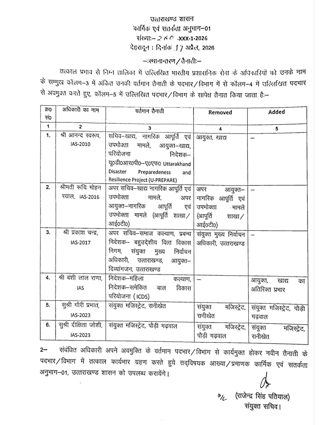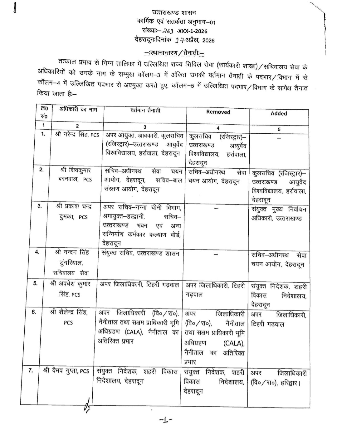 Homeराज्य समाचारबड़ी खबर: शासन में बड़ा प्रशासनिक फेरबदल, IAS और PCS अधिकारियों के... राज्य समाचारउत्तराखंडदेहरादून बड़ी खबर: शासन में बड़ा प्रशासनिक फेरबदल, IAS और PCS अधिकारियों के बंपर तबादले By uttarakhandaaj April 17, 2026 0 3 Share FacebookXWhatsApp देहरादून: उत्तराखंड शासन ने बड़ा प्रशासनिक फेरबदल करते हुए कई, IAS और PCS अधिकारियों के बंपर तबादले किए हैं। Share FacebookXWhatsApp Previous articleMDDA की मुहिम लाई रंग: आढ़त बाजार, तहसील चौक सड़क चौड़ीकरण कार्य ने पकड़ी गति uttarakhandaajhttps://uttarakhandaaj.com RELATED ARTICLES राज्य समाचार MDDA की मुहिम लाई रंग: आढ़त बाजार, तहसील चौक सड़क चौड़ीकरण कार्य ने पकड़ी गति April 17, 2026 क्राइम Police Action: अलग-अलग थाना क्षेत्रों से नाबालिग के साथ दुष्कर्म करने वाले 02 अभियुक्तों को किया गिरफ्तार April 17, 2026 राज्य समाचार अलग-अलग थाना क्षेत्रों में हुई चोरी की 02 घटनाओं का दून पुलिस ने किया खुलासा April 17, 2026 LEAVE A REPLY Cancel reply Comment: Please enter your comment! Name:* Please enter your name here Email:* You have entered an incorrect email address! Please enter your email address here Website: Save my name, email, and website in this browser for the next time I comment. STAY CONNECTED123FansLike234FollowersFollow0SubscribersSubscribe Latest News MDDA की मुहिम लाई रंग: आढ़त बाजार, तहसील चौक सड़क चौड़ीकरण कार्य ने पकड़ी गति April 17, 2026 Police Action: अलग-अलग थाना क्षेत्रों से नाबालिग के साथ दुष्कर्म करने वाले 02 अभियुक्तों को किया गिरफ्तार April 17, 2026 अलग-अलग थाना क्षेत्रों में हुई चोरी की 02 घटनाओं का दून पुलिस ने किया खुलासा April 17, 2026 उत्तराखंड में जनगणना 2027 प्रशिक्षण कार्यक्रमों में तेजी: विभिन्न क्षेत्रों में एन्यूमरेटर एवं सुपरवाइजर प्रशिक्षण संपन्न April 17, 2026 टिहरी में कांग्रेस का आंदोलन नौटंकी: धामी सरकार प्रतापनगर के हित में लगातार कर रही काम: राजेश्वर पैन्यूली April 17, 2026 DM सविन के निर्देशन पर : पेंशनरों के भौतिक सत्यापन हेतु 22 व 24 अप्रैल को आयोजित होगा विशेष शिविर April 17, 2026 Load more