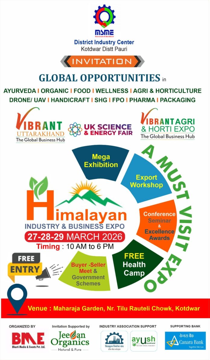 कोटद्वार शहर में पहली बार हिमालयन इंडस्ट्री एंड बिजनेस एक्सपो का आयोजन 27 से 29 मार्च तक महाराजा गार्डन, तीलू रौतेली चौक के निकट किया जाएगा। कार्यक्रम का आयोजन जिला उद्योग केंद्र कोटद्वा द्वारा कराया जा रहा है।