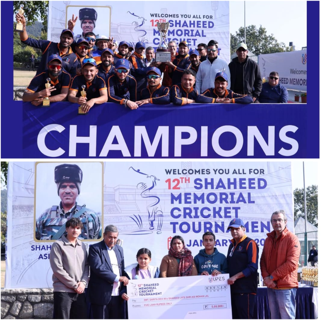 देहरादून, 13 जनवरी 2026। उत्कृष्ट खेल प्रदर्शन और उद्देश्यपूर्ण प्रतिबद्धता का परिचय देते हुएए UPES ने शहीद मेमोरियल क्रिकेट टूर्नामेंट के 12वें संस्करण में जीत दर्ज करते हुए लगातार छठी बार चैम्पियनशिप अपने नाम की। प्रोजेक्ट नमन के अंतर्गत आयोजित यह वार्षिक टूर्नामेंट देश के वीर शहीदों के साहस और बलिदान को सम्मानित करता हैए साथ ही उनके परिवारों को सार्थक वित्तीय एवं सामाजिक सहयोग प्रदान करता है।