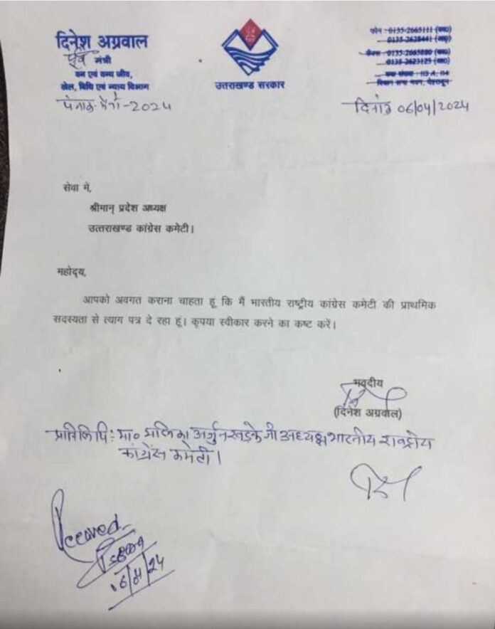 उत्तराखंड लोकसभा चुनाव से पहले कांग्रेस को एक बड़ा झटका लगा है कांग्रेस के पूर्व कैबिनेट मंत्री एवं वरिष्ठ नेता दिनेश अग्रवाल ने कांग्रेस से इस्तीफा दे दिया है इन वरिष्ठ कांग्रेस कांग्रेस नेता के भाजपा में शामिल होने की चर्चाएं जोरों पर हैं