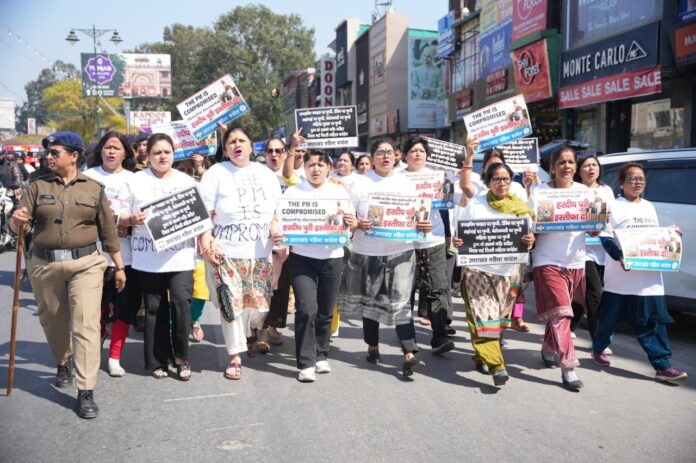 महिला कांग्रेस ने “THE PM IS Compromised” लिखी विषेश पोषाक पहनकर किया विरोध प्रदर्शन