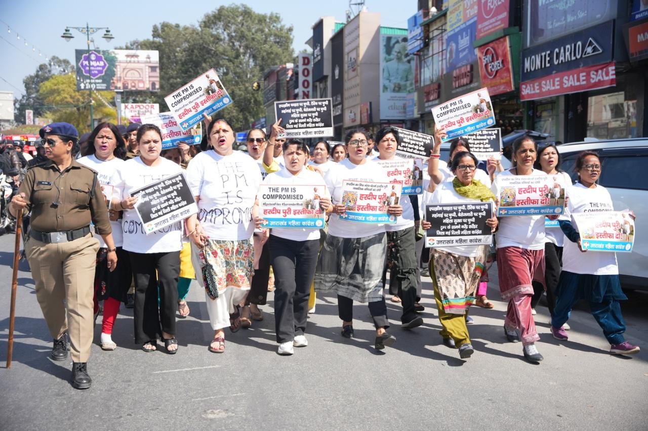 प्रधानमंत्री नरेन्द्र मोदी एवं केन्द्रीय मंत्री हरदीप पुरी का नाम एपस्टीन फाईल में उजागर होने पर हरदीप पुरी के इस्तीफे की मंाग को लेकर आज प्रदेश महिला कांग्रेस अध्यक्ष श्रीमती ज्योत रौतेला के नेतृत्व में महिला कंाग्रेस कार्यकर्ताओं ने प्रदेश कांग्रेस कार्यालय राजीव भवन से गांधीपार्क-घंटाघर-पल्टन बाजार होते हुए तहसील चौक एवं वापस प्रदेश कांग्रेस कार्यालय तक **THE PM IS Compromised** लिखी विषेश पोषाक पहनकर विरोध-प्रदर्शन के साथ मार्च निकाला तथा केन्द्रीय मंत्री हरदीप पुरी के इस्तीफे की मांग की।