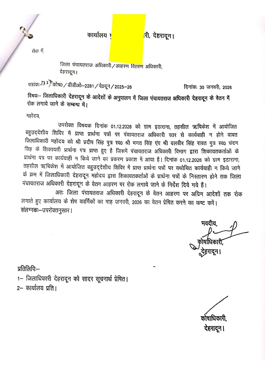 इसके बावजूद पंचायतराज स्तर पर समयबद्ध कार्यवाही न किए जाने की शिकायत जिलाधिकारी को प्राप्त हुई। शिकायतकर्ताओं के प्रार्थना पत्रों पर अपेक्षित कार्रवाई में लापरवाही पाए जाने पर जिलाधिकारी ने संज्ञान लेते हुए प्रकरण के निस्तारण तक जिला पंचायत राज अधिकारी, देहरादून के वेतन आहरण पर अग्रिम आदेशों तक रोक लगाने के निर्देश दिए थे, जिसके फलस्वरुप जिला पंचायत राज अधिकारी, देहरादून के वेतन आहरण पर रोक लगा दी गई है।