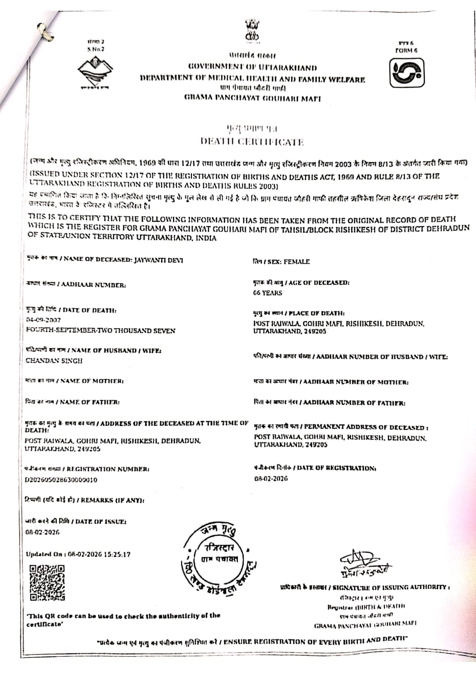 वेतन रोकने की कार्रवाई के तत्पश्चात संबंधित ग्राम पंचायत विकास अधिकारी, ग्राम पंचायत गौहरी माफी द्वारा प्रदीप सिंह के पिता स्व० भगत सिंह तथा बलबीर सिंह रावत की माता स्व० जयवन्ती देवी का मृत्यु प्रमाण पत्र 08.02.2026 को जारी कर दिया गया है। प्रकरण के निस्तारण उपरांत जिला पंचायत राज अधिकारी, देहरादून के वेतन आहरण पर लगी रोक हटाए जाने के संबंध में पत्रावली उच्च स्तर पर प्रस्तुत की गई है। जिला प्रशासन के सख्त निर्देश हैं कि जनमानस की शिकायतों के निस्तारण में किसी भी प्रकार की लापरवाही पर क्षम्य नही होगी। अधिकारियों को निर्देशित किया गया है कि समयबद्ध एवं पारदर्शी कार्यप्रणाली सुनिश्चित करना सभी अधिकारियों की जिम्मेदारी है। इसमें किसी भी प्रकार की हिलाहवाली स्वीकार्य नहीं होगी ।