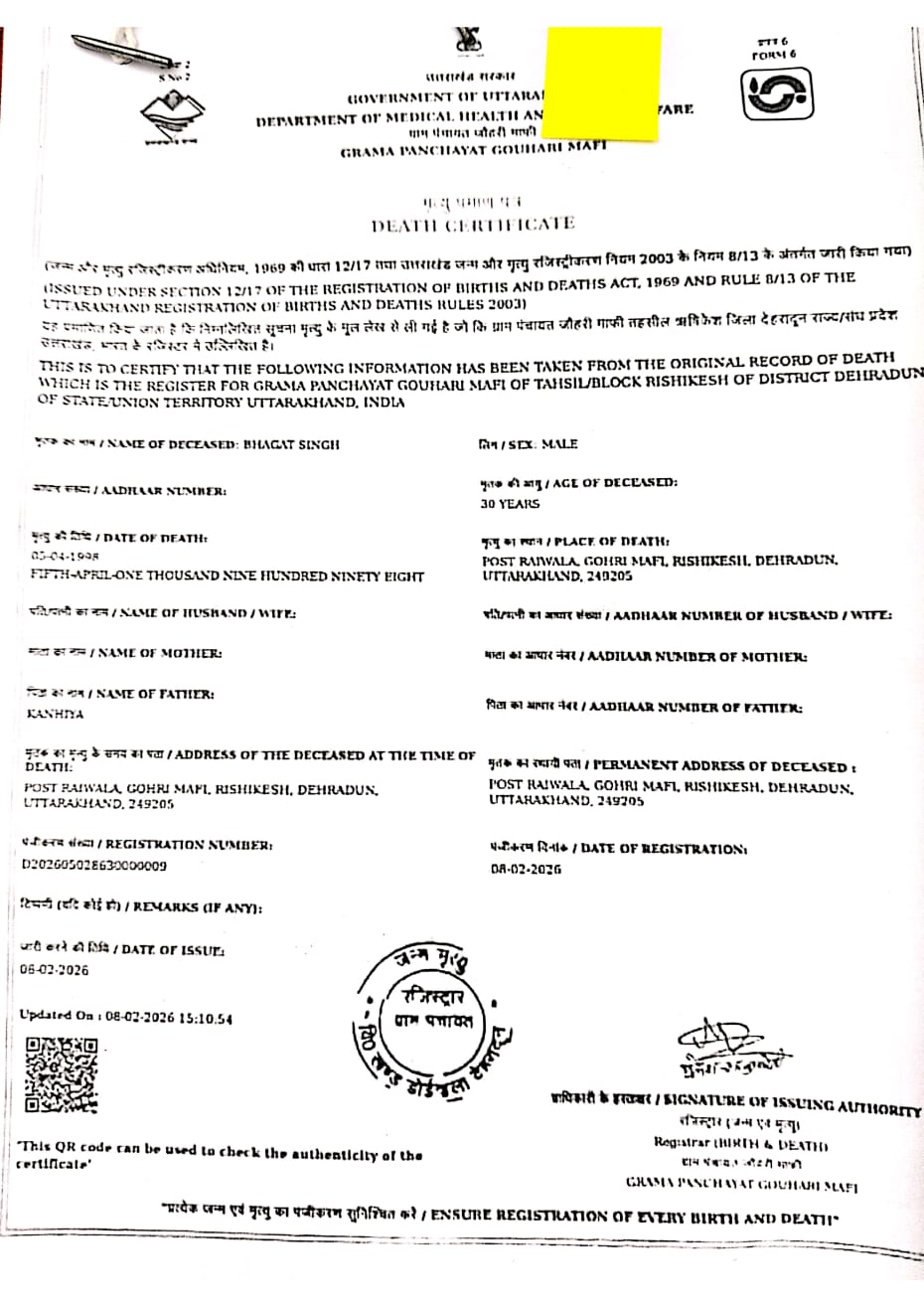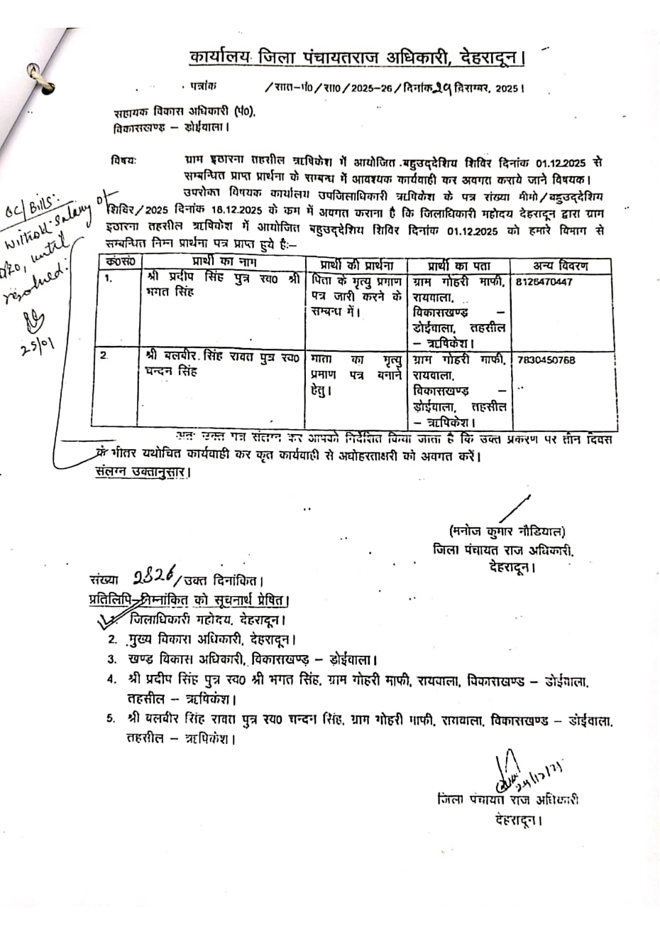 देहरादून। जिलाधिकारी सविन बंसल की अध्यक्षता में जिले के विकास खंड डोईवाला ग्राम इठारना, तहसील ऋषिकेश में 01.12.2025 को आयोजित बहुउद्देशीय शिविर में प्राप्त शिकायतों के क्रम में जिला प्रशासन ने सख्त कार्रवाई की है। ग्राम पंचायत गौहरी माफी निवासी प्रदीप सिंह पुत्र स्व० भगत सिंह द्वारा अपने पिताजी का मृत्यु प्रमाण पत्र जारी किए जाने तथा बलबीर सिंह रावत पुत्र स्व० चन्दन सिंह द्वारा अपनी माता स्व० जयवन्ती देवी का मृत्यु प्रमाण पत्र जारी न किए जाने संबंधी शिकायत प्रस्तुत की गई थी।