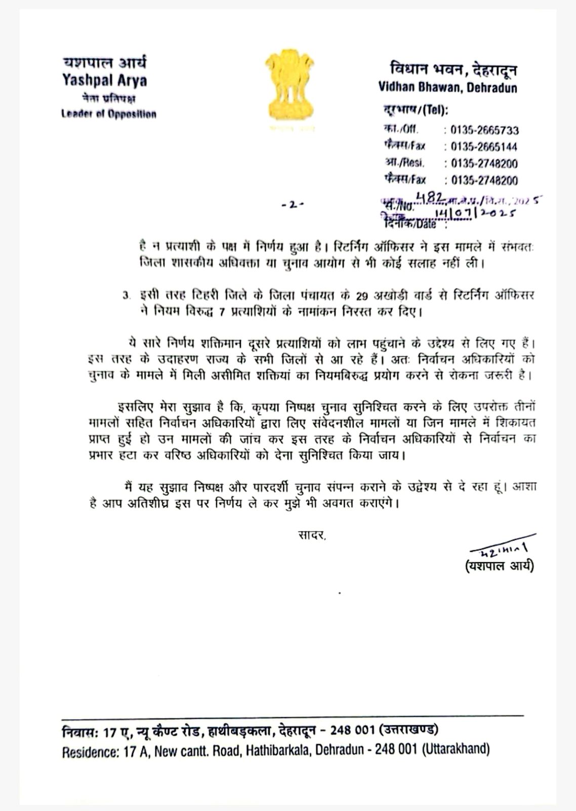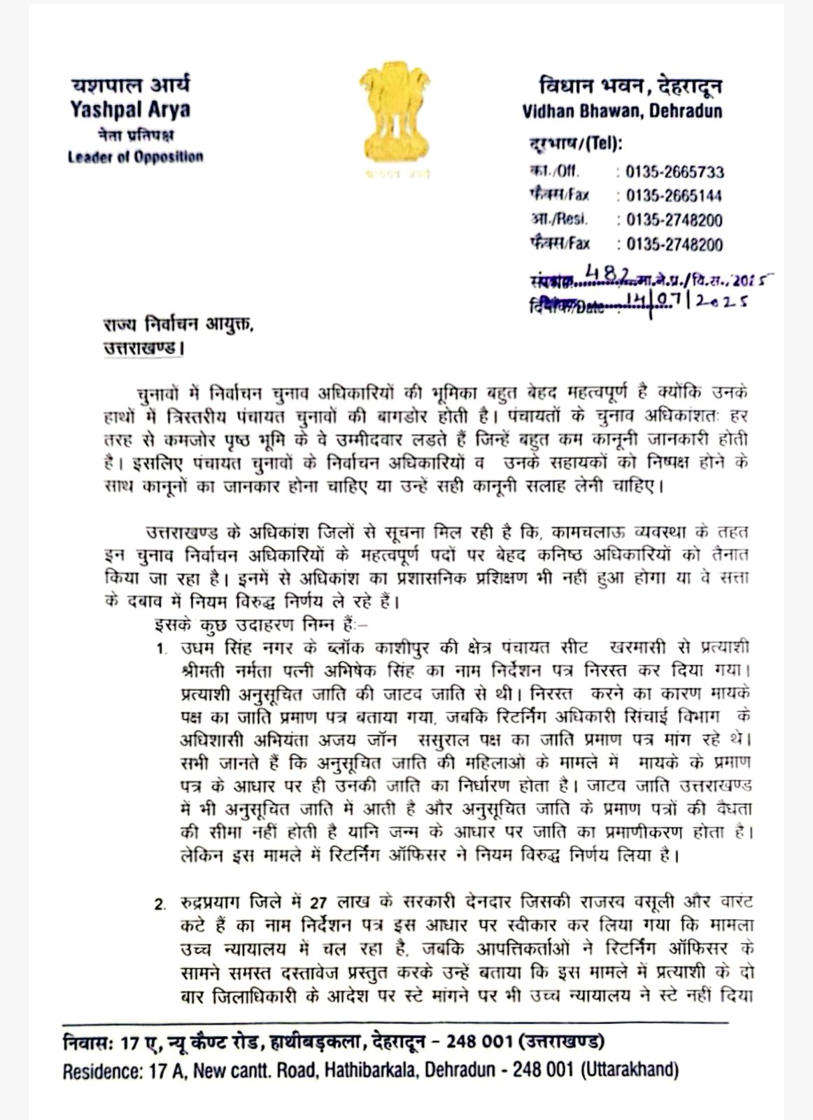 उत्तराखण्ड के अधिकांश जिलों से सूचना मिल रही है कि, कामचलाउ व्यवस्था के तहत निर्वाचन अधिकारियों के महत्वपूर्ण पदों पर बेहद कनिष्ठ अधिकारियों को किया जा रहा तैनात-यशपाल आर्य