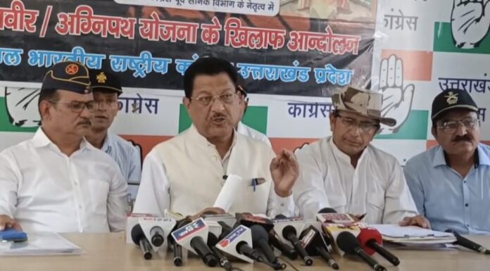 देहरादून: उत्तराखंड प्रदेश कांग्रेस पूर्व सैनिक विभाग आगामी चार अक्टूबर से अग्निपथ योजना के तहत भर्ती किए जाने वाले अग्निवीर योजना के बारे में प्रदेश भर में जन जागरण करने, सेना में अग्निपथ योजना बंद कर पूर्व की भांति भर्तियां शुरू करने की मांग के लिए व्यापक हस्ताक्षर अभियान चलाने के उद्देश्य से एक रथ यात्रा का आयोजन करेगा जिसका शुभारंभ आगामी चार अक्टूबर को देहरादून में प्रदेश कांग्रेस मुख्यालय में प्रदेश अध्यक्ष करण माहरा हरि झंडी दिखा कर यात्रा को शुरू करवाएंगे। उक्त जानकारी देते हुए प्रदेश कांग्रेस पूर्व सैनिक विभाग अध्यक्ष कर्नल राम रतन सिंह नेगी ने बताया कि यात्रा तीन चरणों में अक्टूबर में गढ़वाल, दिसंबेमें कुमाऊं व फरवरी में हरिद्वार रुड़की व उधम सिंह नगर में जाएगी। कर्नल नेगी ने कहा कि यात्रा के दौरान पदयात्रा, सम्मेलन , गोष्ठियां व रैलियां आयोजित की जाएंगी व युवा बेरोजगारों से अग्निपथ योजना बंद करने व पुरानी भर्ती प्रक्रिया शुरू करने की मांग के मांग पत्र पर हस्ताक्षर करवाए जाएंगे जो यात्रा के समापन के पश्चात पार्टी के राष्ट्रीय नेतृत्व के साथ महामहिम राष्ट्रपति को सौंपे जाएंगे।