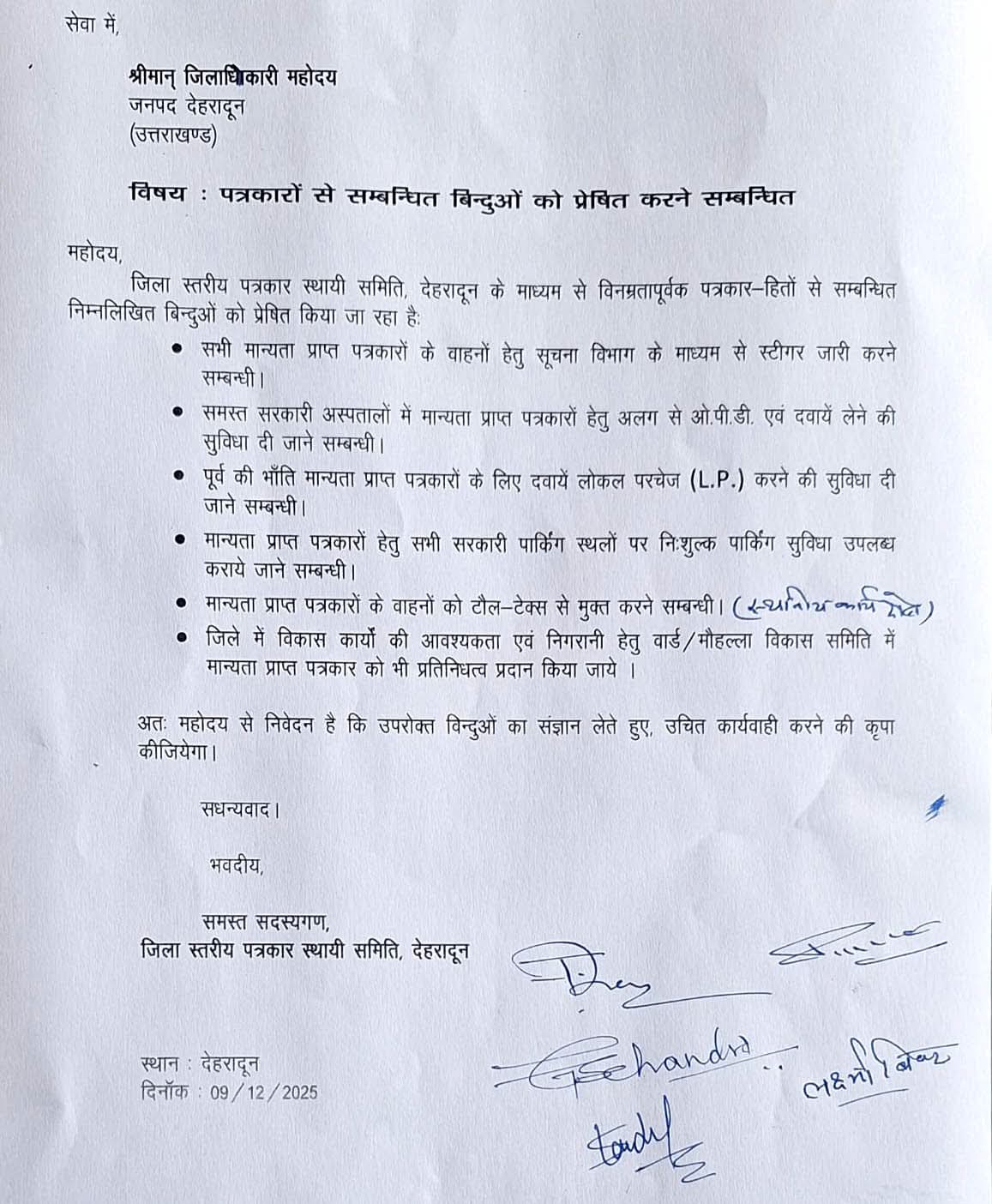 आज जिला स्तरीय पत्रकार स्थाई समिति, देहरादून के अंतर्गत समिति के सभी पत्रकार सदस्यों ने जनपद के लोकप्रिय, कर्मठ एवं संवेदनशील जिलाधिकारी सविन बंसल जी से शिष्टाचार भेंट कर पत्रकारों के हितों से जुड़े 6 महत्वपूर्ण बिंदुओं पर माँग-पत्र सौंपा। जिलाधिकारी महोदय ने सभी बिंदुओं को गंभीरता से सुना और लगभग सभी माँगों पर सहमति जताते हुए संबंधित विभागों को तत्काल पत्र जारी कर कार्यवाही के निर्देश दिए, जो अपने आप में सराहनीय है।