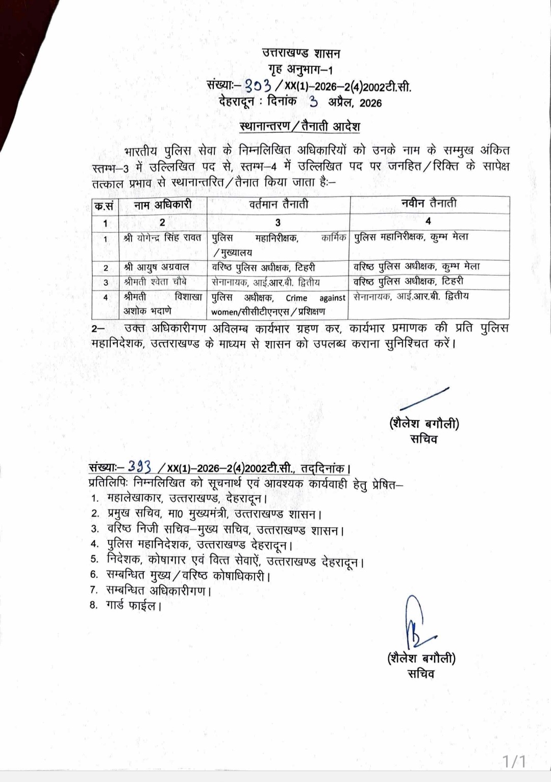 3 अप्रैल को जारी आदेश में 4 आईपीएस अधिकारियों की जिम्मेदारियों में बदलाव किया गया है। माना जा रहा है की आगामी कुंभ मेले को ध्यान में रखते हुए यह तबादले किए गए हैं।