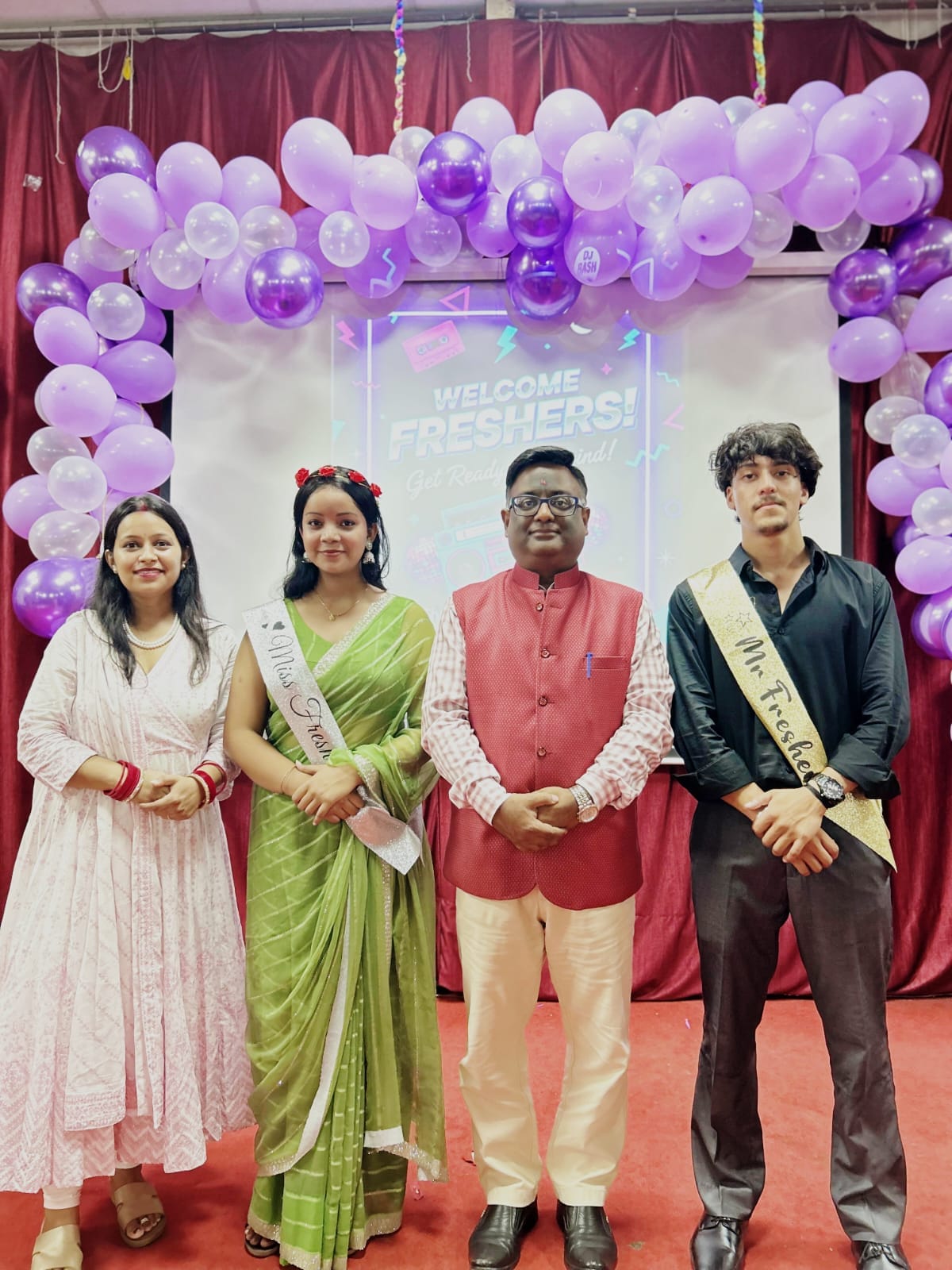 फ्रेशर्स ने अपनी प्रतिभा का प्रदर्शन रैंप वॉक, टैलेंट राउंड और प्रश्नोत्तरी के माध्यम से किया। शानदार प्रतिस्पर्धा के बाद सुधांशु को मिस्टर फ्रेशर और कनिष्का को मिस फ्रेशर का खिताब दिया गया।