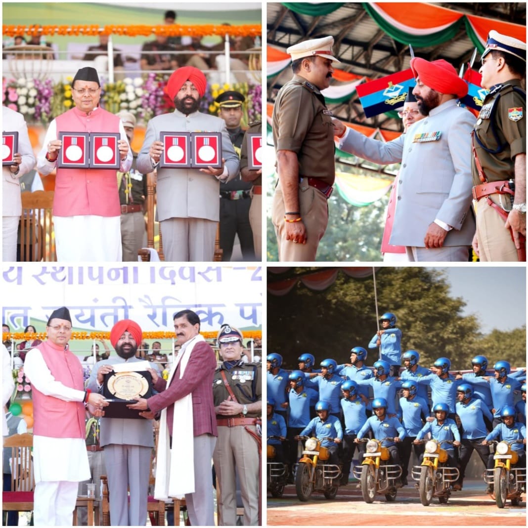उत्तराखण्ड राज्य स्थापना की रजत जयंती समारोह के अवसर पर शुक्रवार को पुलिस लाइन, देहरादून में आयोजित कार्यक्रम में राज्यपाल लेफ्टिनेंट जनरल गुरमीत सिंह (से नि) एवं मुख्यमंत्री पुष्कर सिंह धामी ने प्रतिभाग किया। राज्यपाल ने इस अवसर पर आयोजित रैतिक परेड का निरीक्षण कर सलामी ली। राष्ट्रीय गीत ‘‘वंदे मातरम’’ के 150 वर्ष पूर्ण होने के अवसर पर कार्यक्रम की शुरुआत वंदे मातरम गीत से हुई। इस अवसर पर राज्यपाल एवं मुख्यमंत्री द्वारा ‘‘उत्तराखण्ड पुलिस पत्रिका-2025’’ का विमोचन एवं रजत जयंती पदक के प्रतीकात्मक चिन्ह का अनावरण किया गया।
