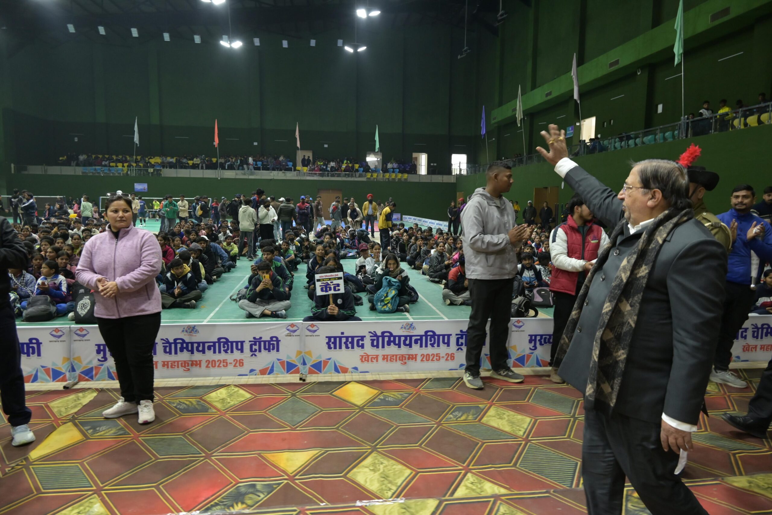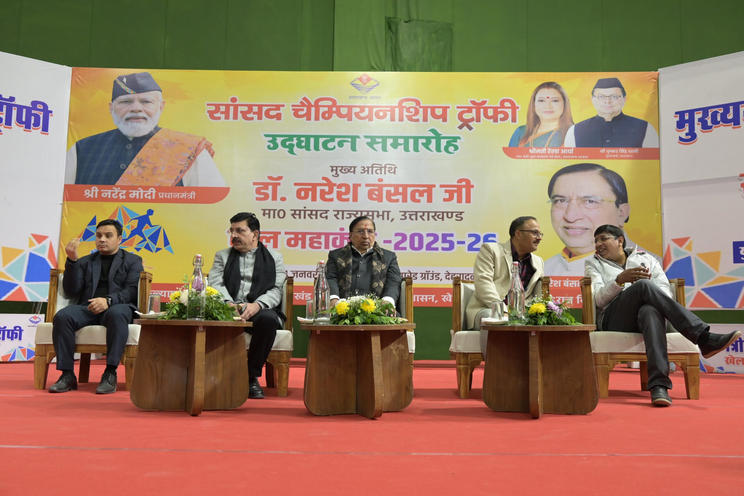 युवा कल्याण विभाग, देहरादून द्वारा खेल एवं शिक्षा विभाग के समन्वय से आज मल्टीपरपज हॉल, परेड देहरादून में मुख्यमंत्री चैम्पियनशिप ट्रॉफी के अन्तर्गत जनपद स्तर पर सांसद चैंम्पियनशिप ट्रॉफी की खेलकूद प्रतियोगिताओं का उद्घाटन मुख्य अतिथि नरेश बंसल, मा० सांसद राज्य सभा द्वारा किया गया। इस अवसर पर विभागीय अधिकारियों/कर्मचारियों द्वारा मुख्य अतिथि को पुष्पगुच्छ, मोमेंटो तथा शॉल भेंट कर उनका स्वागत किया। प्रमोद चन्द्र पॉण्डेय, जिला युवा कल्याण एवं प्रान्तीय रक्षक दल अधिकारी, देहरादून द्वारा मुख्यमंत्री चैम्पियशिप ट्रॉफी के अन्तर्गत विभिन्न स्तरों पर आयोजित होने वाली प्रतियोगिताओं तथा सांसद चैम्पियनशिप ट्रॉफी की खेलकूद प्रतियोगिताओं के बारे में अवगत कराया तथा मुख्य अतिथि को खिलाड़ियों से भी परिचित कराया। मुख्य अतिथि द्वारा खेलकूद प्रतियोगिताओं में खिलाड़ियों को खेल भावना से प्रतिभाग करने की अपेक्षा की। मुख्य अतिथि द्वारा खिलाड़ियों को जीवन में खेलों की उपयोगिता के बारे में बताते हुए उन्हें आशीर्वचन दिया तथा उनका उत्साहवर्द्धन किया गया।