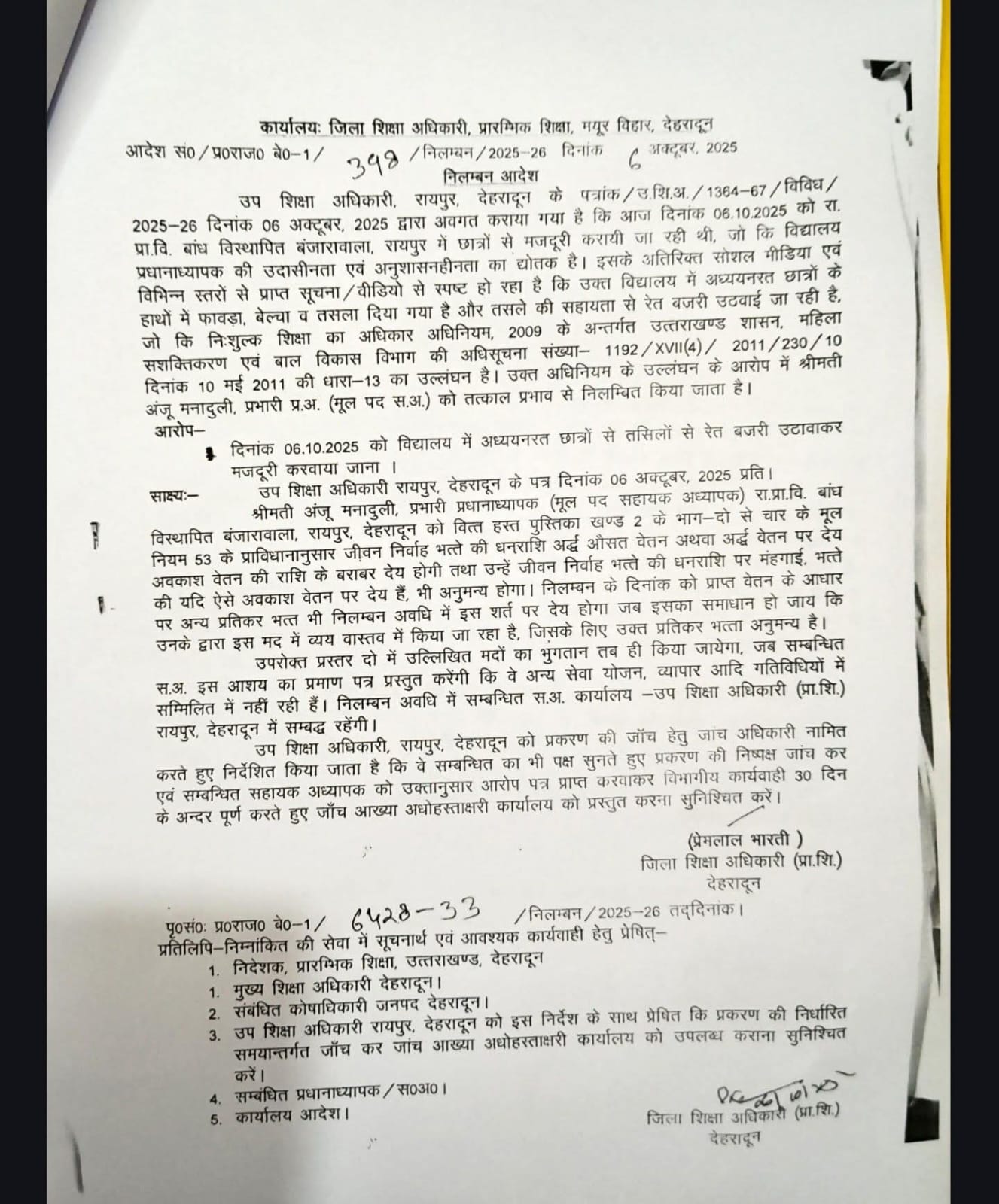 देहरादून 06 अक्टूबर,2025 (सू.वि), राजकीय प्राथमिक विद्यालय बांध विस्थापित बंजारावाला, देहरादून में छात्रों से बजरी, रेता, मिट्टी ढुलाई कराने संबंधी सोशल मीडिया पर प्रचारित वीडियो का संज्ञान लेते हुए मुख्य शिक्षा अधिकारी ने विद्यालय की प्रधानाचार्य को तत्काल प्रभाव से निलंबित करने का आदेश जारी किया।