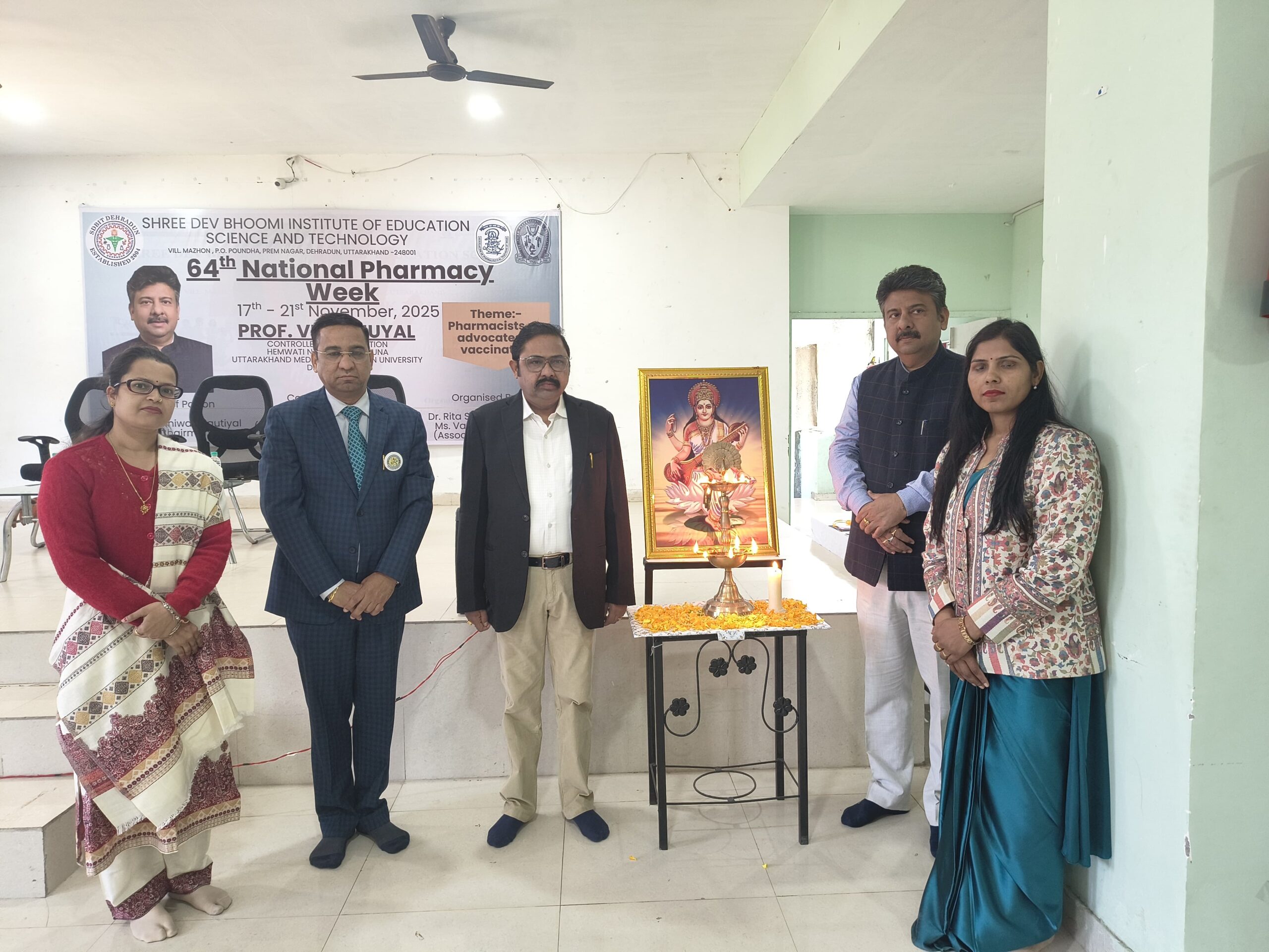 श्री देवभूमि इंस्टिट्यूट ऑफ़ एजुकेशन साइंस एंड टेक्नोलॉजी पौंधा देहरादून में दिनांक 11.2025 से दिनांक 21.11.2025 तक संस्थान में 64वें National Pharmacy Week-2025 कार्यक्रम का आयोजन किया गया। जिसके उदघाटन समारोह मे मुख्य अतिथि श्रीनिवास नौटियाल, अध्यक्ष एवं डा0 शिवानंद पाटिल, निदेशक श्री देव भूमि इंस्टीट्यूट ऑफ एजुकेशन, साईंस एण्ड टैक्नोलॉजी, पौंधा, देहरादून द्वारा दीप प्रज्जवलित कर किया गया। इस दौरान डा0 शिवानंद पाटिल, निदेशक द्वारा फार्मेसी पाठयक्रम के छात्र-छात्राओं को संबोधित करते हुए फार्मेसी के क्षेत्र में होने वाले निरंतर बदलाव के बारे में जागरुक किया एवं सभी छात्र-छात्राओं को पढ़ाई के साथ-साथ खेलकूद प्रतियोगिताओं में प्रतिभाग करने के लिए भी प्रेरित किया। उन्होनें कहा कि राष्ट्रीय फार्मेसी सप्ताह का उद्देश्य आम जनता के बीच फार्मासिस्टों की भूमिका के बारे में जागरुकता बढ़ाना है, न कि केवल दवाइयॉं बांटना। इस समारोह में विभिन्न प्रकार के खेलो (बैडमिंटन, टग ऑफ वार, शतरंज, कैरम, शॉट पुट, फेस पेंटिंग, फूड स्टॉल, म्यूजिकल चेयर, रंगोली, पोस्टर प्रेजटेंशन, ब्लड डोनेशन, संास्कृतिक कार्यक्रम एवं डिस्कस थ्रो) आदि का भी आयोजन किया गया। तथा इस दौरान संस्थान में दिनांक 18.11.2025 को रक्तदान शिविर का आयोजन भी किया गया था जिसमें दून मेडिकल कॉलेज से ब्लड बैंक के सदस्यों द्वारा छात्र-छात्राओं को रक्तदान के महत्व के बारे में जानकारी दी तथा भविष्य में रक्तदान के बारे में छात्र-छात्राओं को प्रेरित किया।