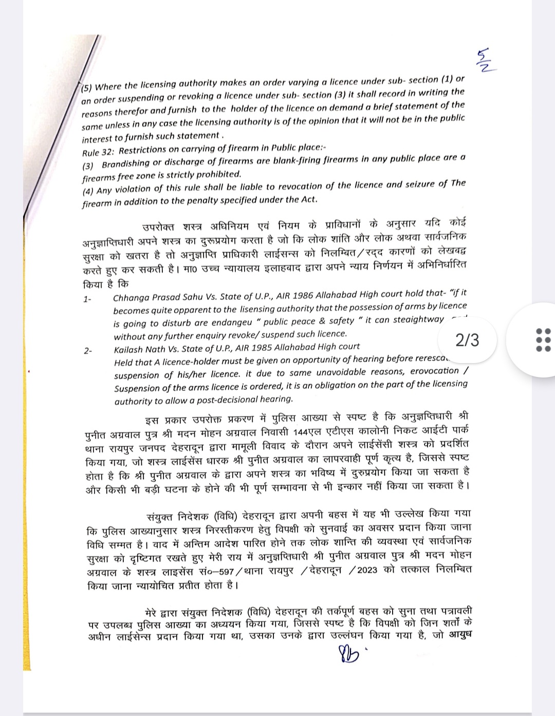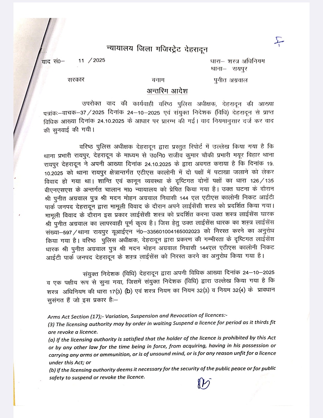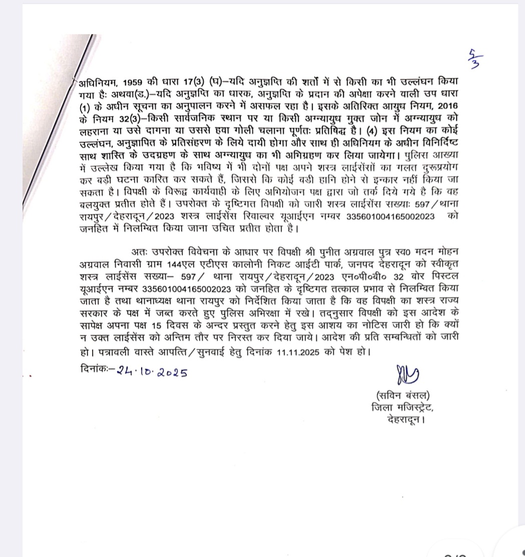 उक्त घटना पर वरिष्ठ पुलिस अधीक्षक देहरादून द्वारा प्रस्तुत रिपोर्ट में उल्लेख किया गया कि थाना प्रभारी रायपुर, देहरादून के माध्यम से उ०नि० चौकी प्रभारी मयूर विहार थाना रायपुर देहरादून ने अपनी आख्या 24.10.2025 के द्वारा अवगत कराया है कि 19.10.2025 को थाना रायपुर क्षेत्रान्तर्गत एटीएस कालोनी में दो पक्षों में पटाखा जलाने को लेकर विवाद हो गया था। शान्ति एवं कानून व्यवस्था के दृष्टिगत दोनों पक्षों का धारा 126/135 बीएनएसएस के अन्तर्गत चालान मा० न्यायालय को प्रेषित किया गया है। उक्त घटना के दौरान पुनीत अग्रवाल पुत्र मदन मोहन अग्रवाल निवासी 144 एल एटीएस कालोनी निकट आईटी पार्क जनपद देहरादून द्वारा मामूली विवाद के दौरान अपने लाईसेंसी शस्त्र को प्रदर्शित किया गया। मामूली विवाद के दौरान इस प्रकार लाईसेंसी शस्त्र को प्रदर्शित करना उक्त शस्त्र लाईसेंस घारक पुनीत अग्रवाल का लापरवाही पूर्ण कृत्य है जिस पर उनका शस्त्र जब्त करते हुए लाईसेंस धारक का शस्त्र लाईसेंस निलिम्बत कर दिया गया है। वरिष्ठ पुलिस अधीक्षक, देहरादून द्वारा प्रकरण की गम्भीरता के दृष्टिगत लाईसेंस धारक पुनीत अग्रवाल पुत्र मदन मोहन अग्रवाल निवासी 144एल एटीएस कालोनी का शस्त्र लाईसेंस संख्या-597/थाना रायपुर यूआईएन नं0-335601004165002023 को निरस्त करने का अनुरोध किया गया, जिस पर जिलाधिकारी ने लाईसेंस निलम्बित करते हुए शस्त्र जब्त करवा दिया है। तथा लाइसेंस निरस्तीकरण की कार्रवाई प्रारंभ कर दी गई है।