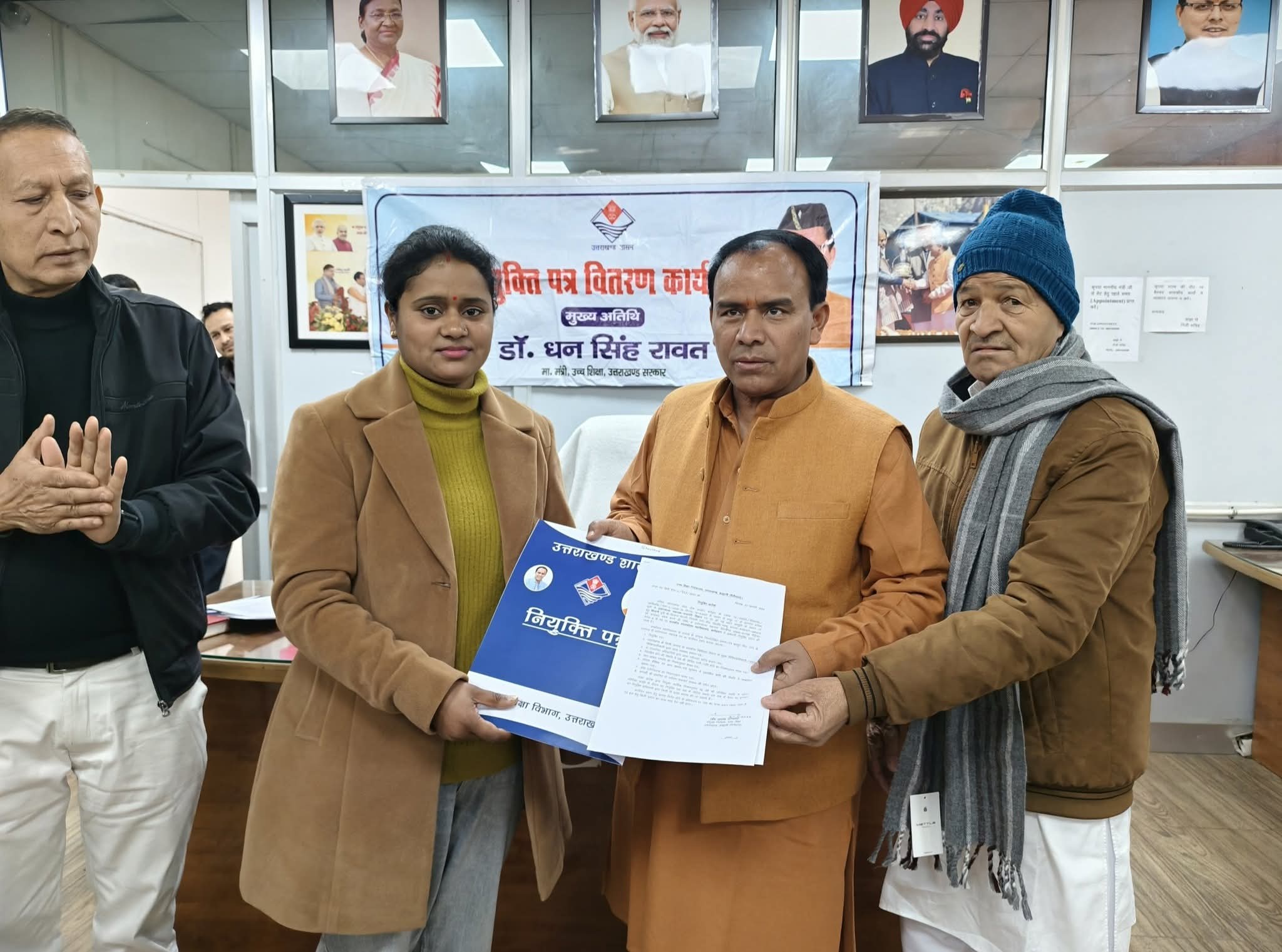 उच्च शिक्षा मंत्री डॉ धन सिंह रावत ने आज अपने शासकीय आवास पर उच्च शिक्षा विभाग के अंतर्गत राज्य लोक सेवा आयोग के माध्यम से प्रयोगशाला सहायक पद पर प्रतीक्षा सूची से चयनित 10 अभ्यर्थियों को नियुक्ति पत्र वितरित किये। जिसमें भौतिक विज्ञान विषय में 01, जन्तु विज्ञान में 3, वनस्पति विज्ञान 4 तथा भूगोल में 2 अभ्यर्थियों का चयन किया गया। इन सभी चयनित अभ्यर्थियों को प्रदेश के दुर्गम क्षेत्र के महाविद्यालयों में प्रथम तैनाती दी गई है। जिसमें भौतिक विज्ञान विषय में राकेश चन्द्र बिनवाल को द्वाराहाट महाविद्यालय में प्रथम तैनाती दी गई है। इसी प्रकार जन्तु विज्ञान में विमला मौनी को द्वाराहाट महाविद्यालय, पूजा को कर्णप्रयाग महाविद्यालय एवं रोहन कौशिक को गैरसैण महाविद्यालय में प्रथम तैनाती दी गई है। इसके अलावा वनस्पति विज्ञान में शिवानी को कर्णप्रयाग महाविद्यालय, हरिओम को सतपुली महाविद्यालय, पुलकित प्रताप को द्वाराहाट महाविद्यालय तथा कुलदीप सिंह चौहान को थत्यूड़ महाविद्यालय में तैनाती दी गई है। जबकि भूगोल विषय में प्रयोगशाल सहायक पद पर चयनित महादेव नौटियाल को नैनीडांडा महाविद्यालय तथा हरीश चन्द्र जोशी को काण्डा महाविद्यालय में प्रथम तैनाती दी गई है।