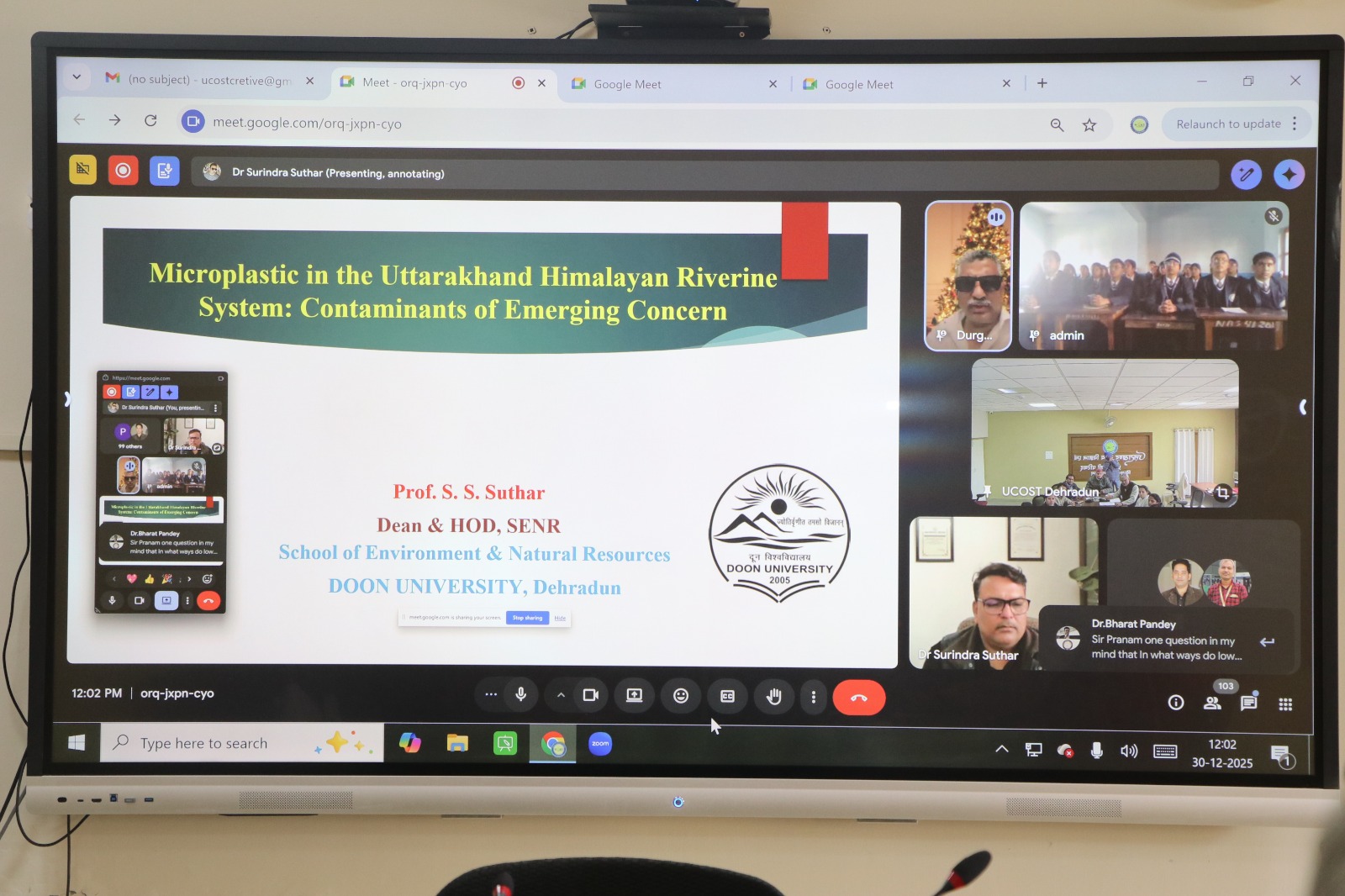 उत्तराखंड राज्य विज्ञान एवं प्रौद्योगिकी परिषद (यूकॉस्ट) द्वारा संचालित “मां धरा नमन एवं जल शिक्षा कार्यक्रम” के अंतर्गत आज 30 दिसंबर 2025 को “माइक्रोप्लास्टिक्स इन हिमालयन रिवराइन सिस्टम: कन्टामिनेंट्स का इमर्जिंग कंसर्न” विषय पर एक विशेषज्ञ व्याख्यान का आयोजन परिषद के सभागार में किया गया ।