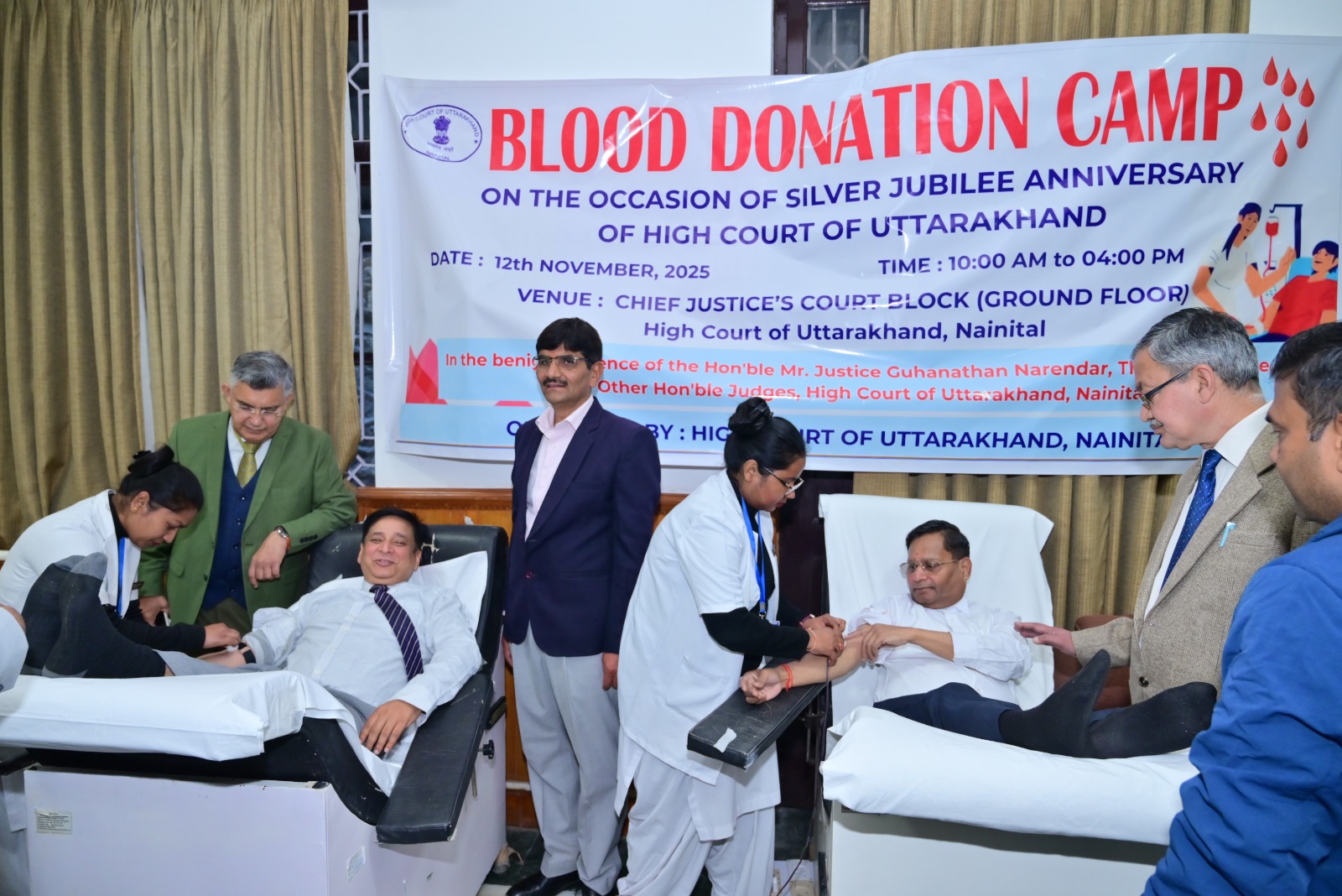 उत्तराखंड उच्च न्यायालय ने अपने परिसर में रक्तदान शिविर का आयोजन किया, जिसका उद्देश्य स्वैच्छिक रक्तदान को बढ़ावा देना और इसके महत्व के प्रति जागरूकता फैलाना था। इस आयोजन में माननीय मुख्य न्यायाधीश श्री गुहनाथन नरेंदर और अन्य वरिष्ठ न्यायाधीशों सहित प्रतिष्ठित न्यायाधीशों की उपस्थिति रही।